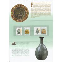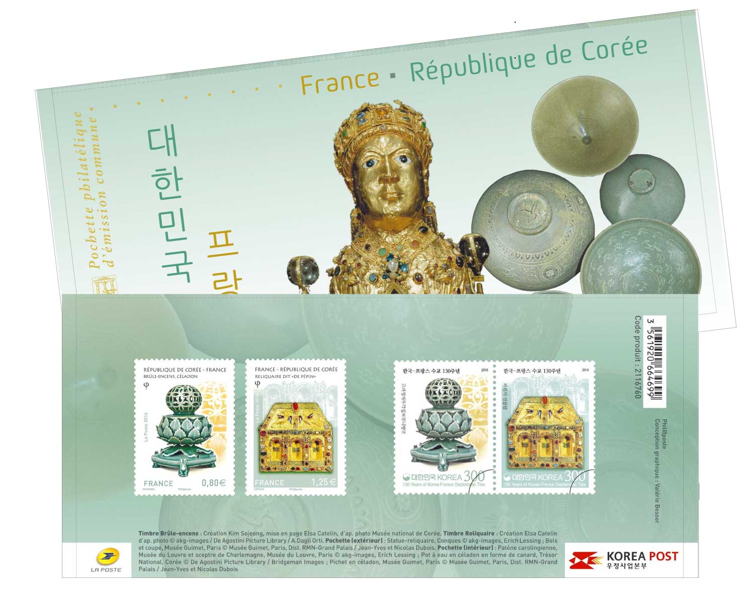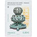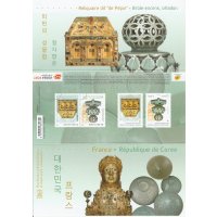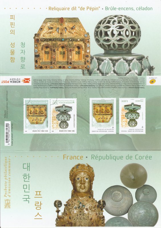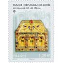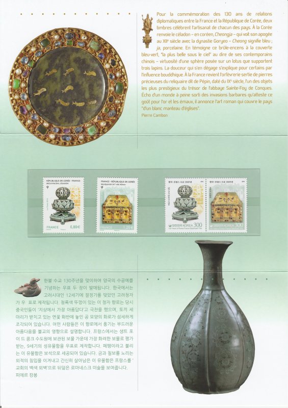 | Commentaire | Artisanat d'Art des deux pays : chef d'oeuvre de la porcelaine : brûleur d'encens en céladon avec motif ajouré du royaume Goryeo (ou Koryo), XIIe siècle, du trésor du musée national de Séoul et chef d'oeuvre de l'orfèvrerie : reliquaire (châsse) dite "de Pépin", trésor de l'abbaye Sainte-Foy de Conques, IXe au XIes. (avec des additions faites aux XIIe, XIIIe et XVIes.) |