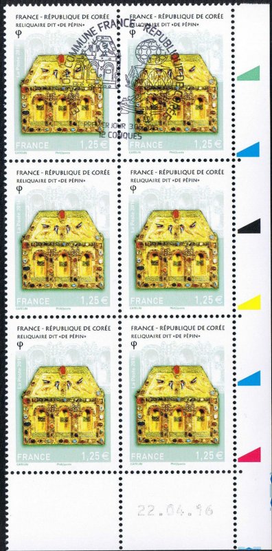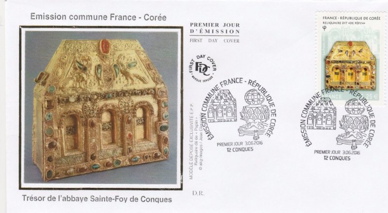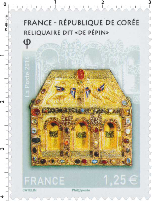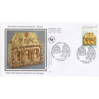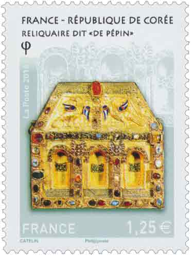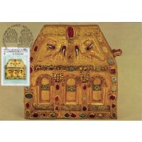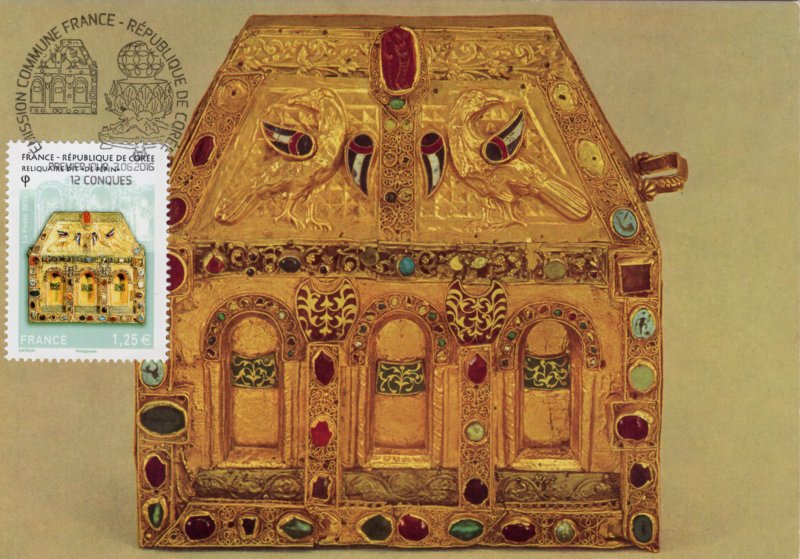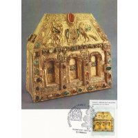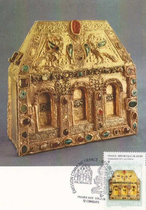 | Commentaire | Chef d'oeuvre de l'orfèvrerie : reliquaire (châsse) dite "de Pépin d'Aquitaine" (autel portatif de Bégon III), trésor de l'abbaye Sainte-Foy de Conques, IXe au XIe siècle (avec des additions faites aux XIIe, XIIIe et XVIe siècles). Il est en forme de maison, au toit couvert de filigranes formant des écailles sur lequel deux oiseaux étalent leurs ailes en émaux cloisonnés. Or, émaux, gemmes, intaille sur cornaline, pierres précieuses en cabochon et gravées, composent cette pièce en bois. |