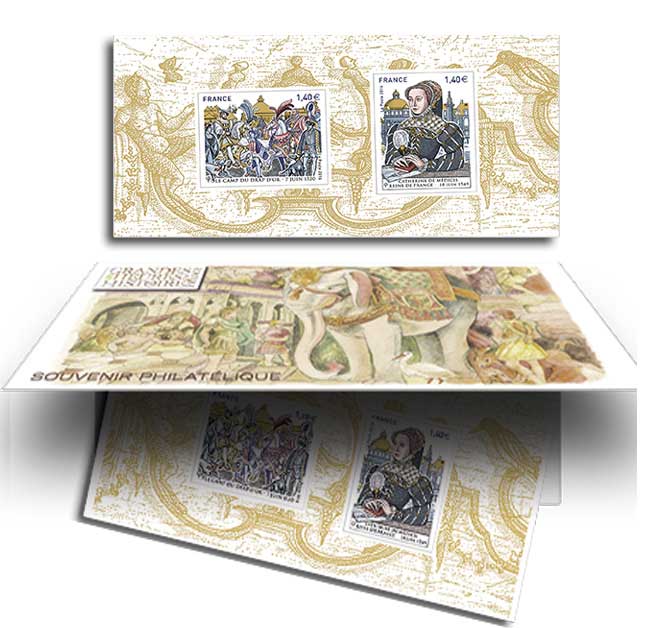 | Commentaire | En savoir plus sur Wikipédia : la Renaissance française Carte double volet dans laquelle est inséré un feuillet gommé reprenant les deux timbres du bloc Visuel de la couverture et du feuillet : "Éléphant royal au caparaçon" (vers 1536), fresque de Giovanni Battista di Jacopo dit Rosso Fiorentino (soit le Maître roux de Florence) - mars 1495-Paris nov. 1540, peintre "maniériste" et décorateur italien de la Renaissance tardive, école de Fontainebleau). L'une des œuvres de la galerie François 1er, au château de Fontainebleau (77-Seine-et-Marne) : construite en 1528, afin de relier les appartements royaux et le couvent des Trinitaires, la galerie François Ier fut ornée d’un décor conçu par le peintre Rosso Fiorentino. Le maître et ses collaborateurs peignirent un cycle de fresques inscrites dans un riche encadrement sculpté de stuc. Les sujets des compositions célébraient la personne du souverain suivant un programme aujourd’hui difficile à décrypter. Marquée par la leçon de Michel-Ange et du maniérisme, la scène de l’Éléphant royal illustre, par le choix du pachyderme, la sagesse et la royauté. |
