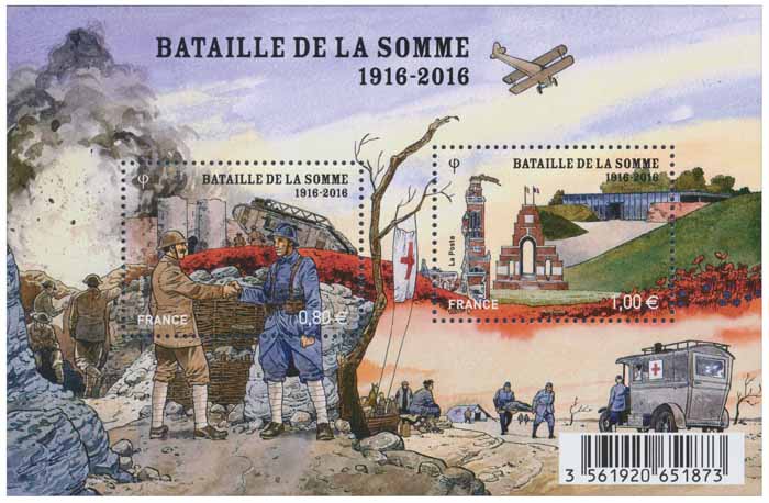 Visuel du bloc-feuillet : plusieurs scènes de cette bataille : la rencontre de soldats anglais et français, l'explosion d'un obus, le champ de bataille survolé par un biplan Nieuport 17 (développé par Gustave Delage et mis en service en mars 1916), les secours proche du front, avec le personnel médical, une tente et une ambulance motorisée de la Croix-Rouge.