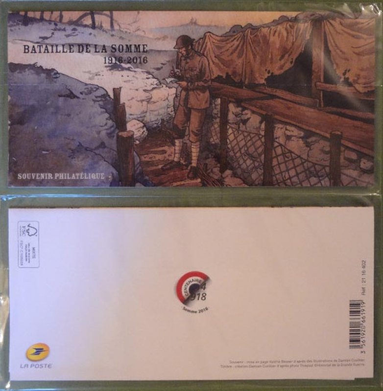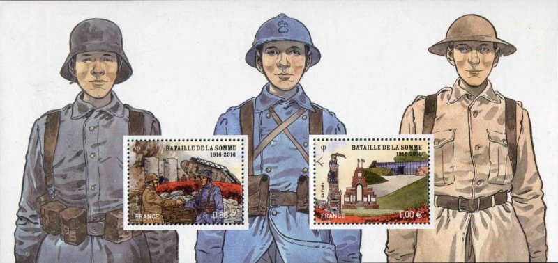 | Commentaire | En savoir plus sur Wikipédia : la bataille de la Somme Visuel de la couverture : dans une tranchée du front, l'abritant durant une accalmie, un soldat anglais écrit aux siens. Visuel du bloc-feuillet : trois soldats côte à côte : allemand, français et anglais (avec leurs tenues et leurs casques militaire durant ce conflit) Le casque allemand s'enfonce plus profondément sur la tête, le casque français (casque Adrian) porte un cimier et l'anglais a les bords plus plats. |