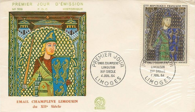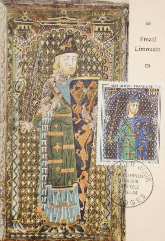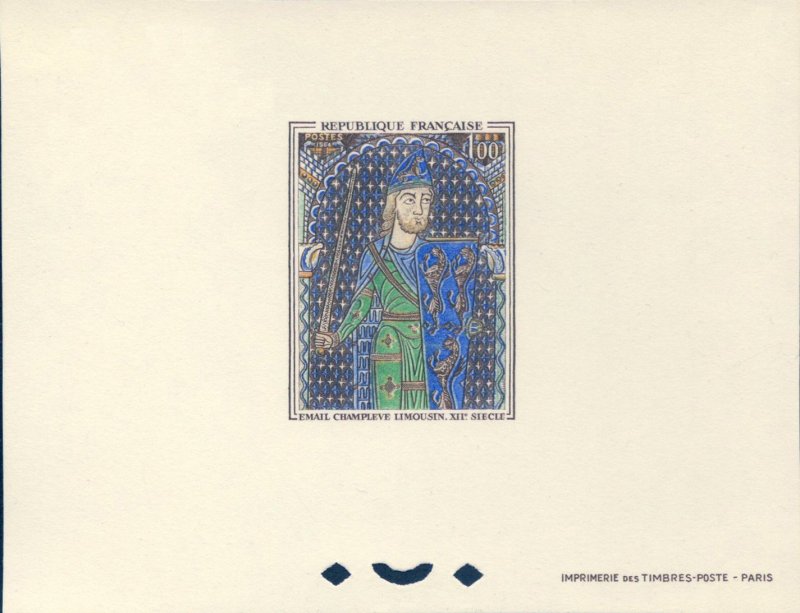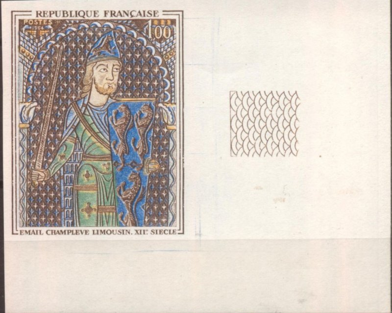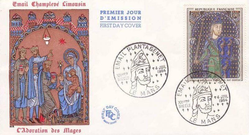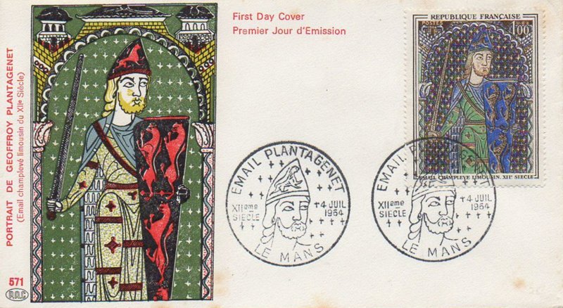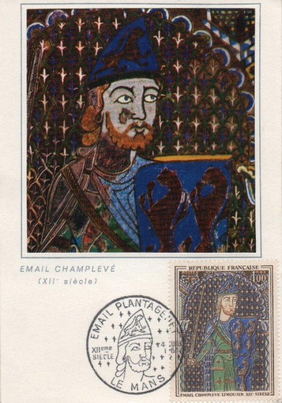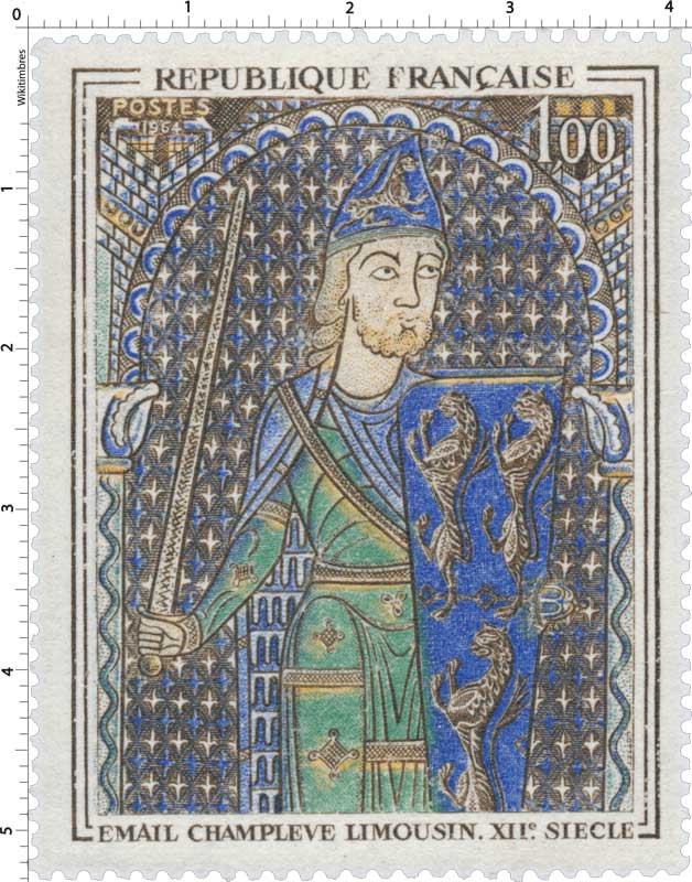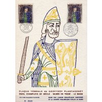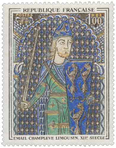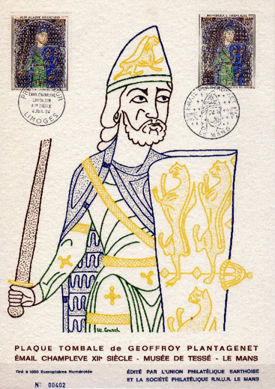 | Commentaire | Geoffroy Plantagenêt : l'émail d'une dynastie Tu t'es déjà demandé comment un simple rameau de genêt a pu donner son nom à une lignée royale ? Eh bien, c'est grâce à Geoffroy IV le Bel, comte d'Anjou et du Maine au XIIe siècle. Ce seigneur, qui portait souvent un brin de genêt à son casque, a été le premier à être surnommé "Plantagenêt". Un détail botanique qui a fleuri en dynastie. Mais ce n'est pas tout. Geoffroy a épousé Mathilde, fille du roi Henri Ier d'Angleterre. Leur union a jeté les bases de la maison Plantagenêt, qui régnera sur l'Angleterre pendant plus de trois siècles. Ironie du sort, Geoffroy lui-même ne montera jamais sur le trône. Comme quoi, parfois, ce sont les racines qui comptent plus que les fruits. Sa plaque tombale, réalisée en 1151, est une merveille de l'art émaillé champlevé, technique où l'on creuse le métal pour y déposer de l'émail coloré. Conservée au musée du Mans, elle a survécu à bien des péripéties : pillages, révolutions, disparitions... Une véritable miraculée de l'histoire. Cette œuvre n'est pas qu'un bel objet. Elle nous parle d'un homme, d'une époque, d'une technique artistique et d'une lignée qui a marqué l'Europe. Elle est le témoin silencieux d'une époque où l'art et le pouvoir se mêlaient étroitement. WikiTimbres |