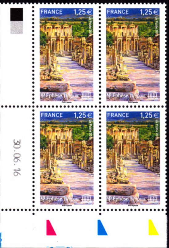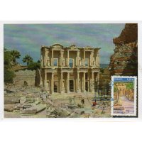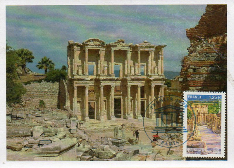| Commentaire | En savoir plus sur Wikipédia : Ephèse Visuel : la façade de la bibliothèque de Celsus (début du IIe s. après J.-C.). Elle fut construite en l'honneur du Gouverneur de la ville, Tiberius Julius Celsus Polemaneus (ou Polemaeanus) par son fils qui lui succéda, Caius Julius Aquila (ou Gaius Julius Aquila, Consul en 110, après J-C.) et de riches citoyens populaires. Les travaux débutèrent en 117 et ne se terminèrent qu'en 135. Elle contenait 12.000 rouleaux protégés de l'humidité par un système d'aération. Elle devait aussi servir comme tombe monumentale pour Celsus. Sa façade était ornée des statues symbolisant : La fortune (Ennoia), la sagesse (Sophia), la science (Épistème) et la vertu (Arete) de Celsus. Elle occupait le troisième rang des plus grandes bibliothèques du monde, derrière celles d’Alexandrie et de Pergame. Icône emblématique et fierté de la cité au IIe siècle, ce bâtiment l’est encore de nos jours, figurant sur certains billets de banque Turcs. Le bâtiment est l'un des rares exemples de bibliothèque ancienne, à l'influence Romaine. |