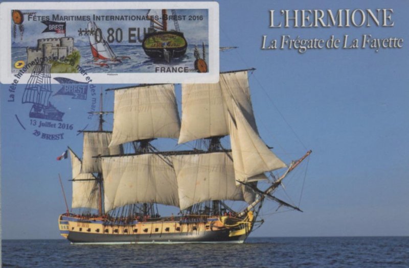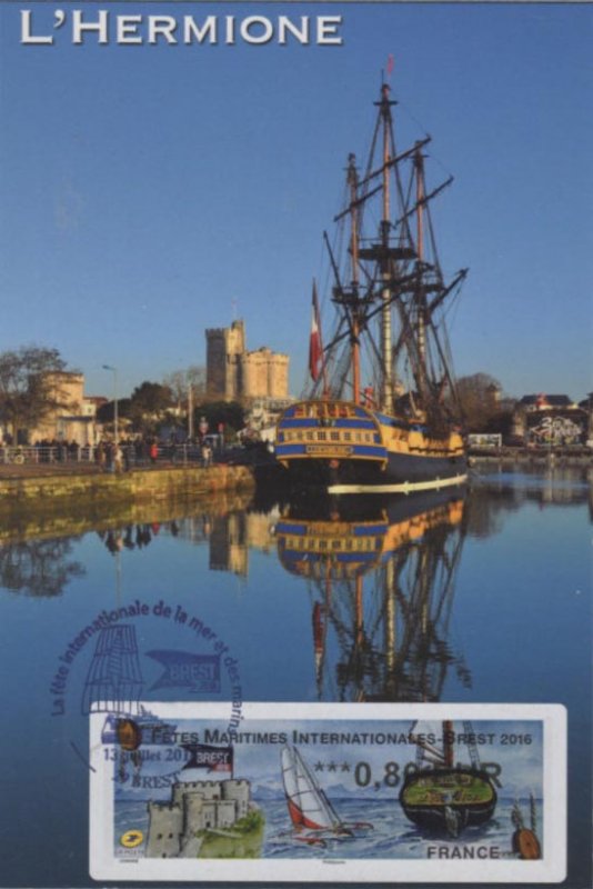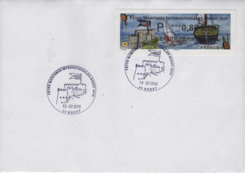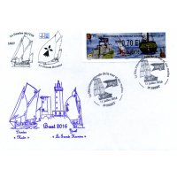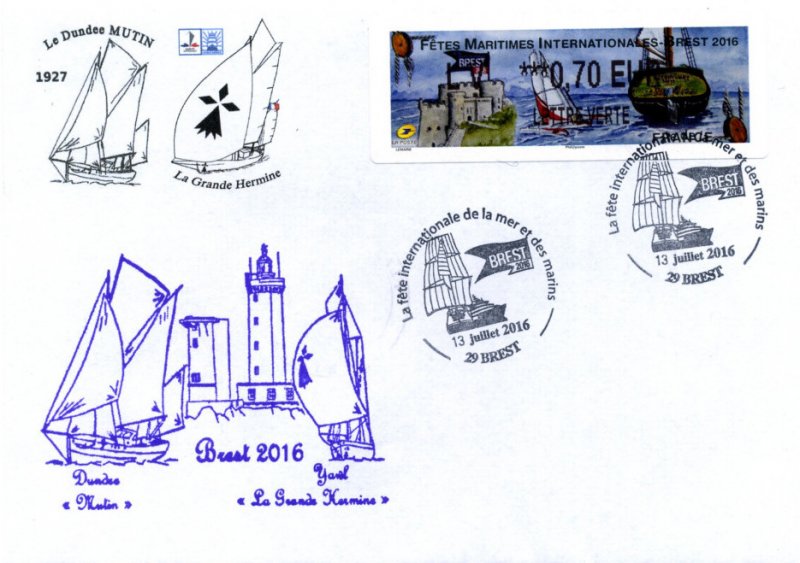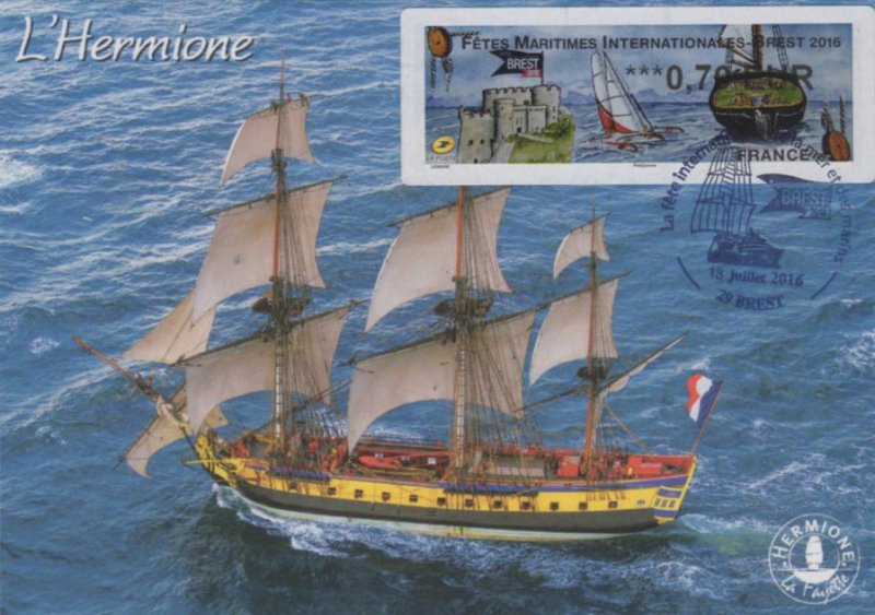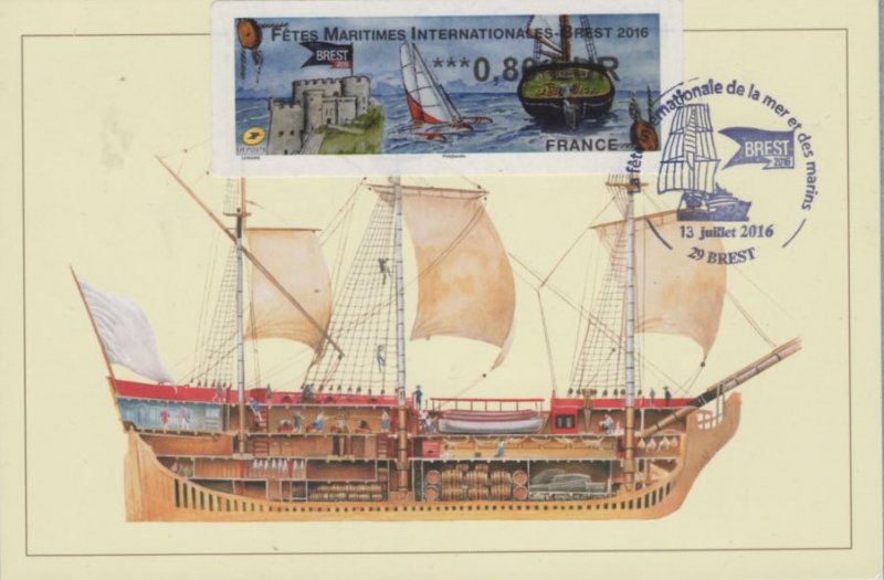 | Commentaire | En savoir plus sur Wikipédia : Fêtes maritimes de Brest Avant d’être organisées à Brest, les premières fêtes trouvent leurs origines dans le fond de la rade. Tout commence en 1980, à Pors Beac’h, une anse paisible sur la rivière de Daoulas. Quelques amoureux des vieux gréements donnent un nouveau souffle à une petite flotte de voiliers traditionnels et se retrouvent l’été pour fêter joyeusement ces témoins de la culture maritime. En 1982, puis 1984 : le rassemblement devient un rendez-vous incontournable avec plus de 10 000 visiteurs et attire toujours plus de bateaux. En 1986, 400 voiliers se donnent rendez-vous et mettent le cap sur Douarnenez qui organisera en 1986 puis en 1988, une grande fête maritime et culturelle, la première de cette ampleur en France. C’est alors que la revue Chasse-marée lance le concours des "Bateaux des côtes de France". Nous sommes à l’aube d’un événement exceptionnel, d’un phénomène unique. Plus de 100 unités du patrimoine maritime sont reconstruites ou restaurées par des chantiers navals. Visuel : - à gauche : le château de Brest dont les derniers bâtiments ont été cédés à la Marine Nationale en 1945 et où y est installée actuellement la Préfecture Maritime. - au centre : un trimaran, clin d’oeil à Eric Tabarly, officier de la Marine Nationale, qui fit construire quelques un de ces voiliers à l'arsenal de Brest - à droite : la poupe de l'aviso-goélette à hunier "La Recouvrance - Brest" – ambassadeur et propriété de la ville de Brest (construction en1990, mise à l'eau le 14 juil.1992). |