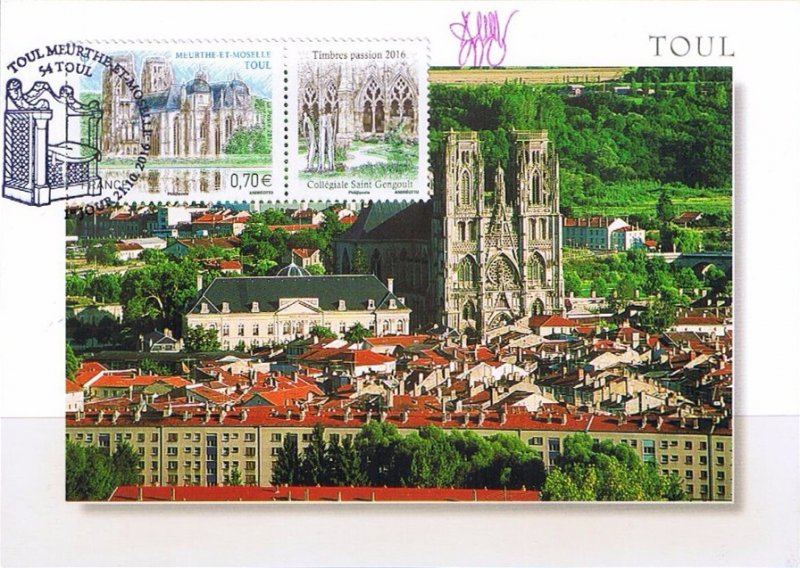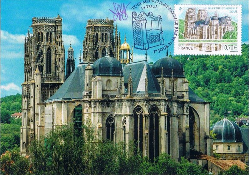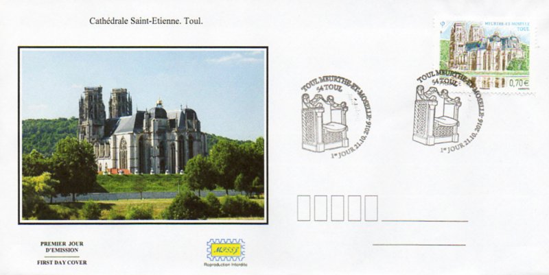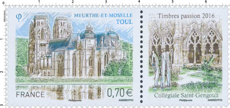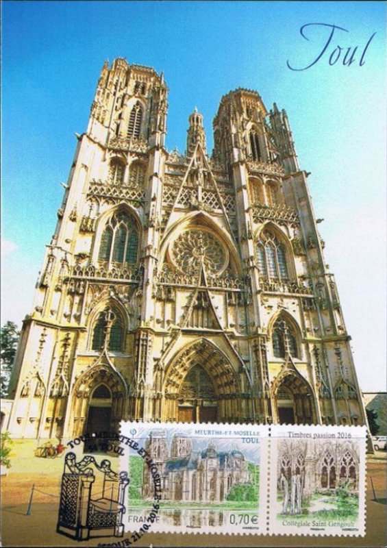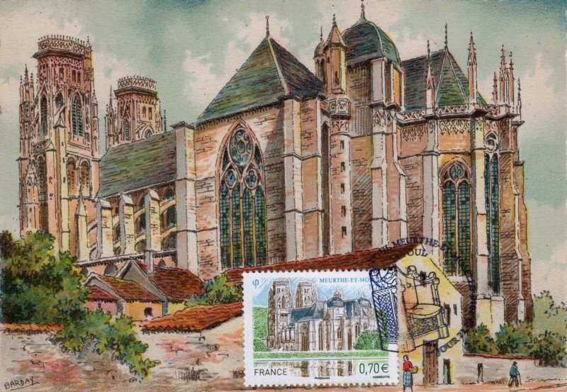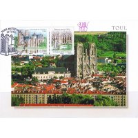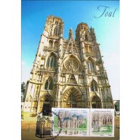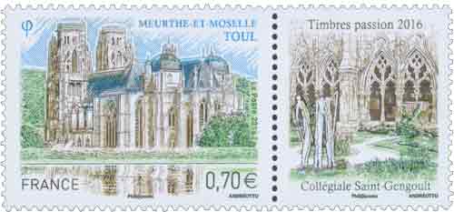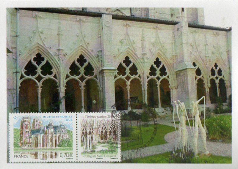 | Commentaire | Visuel du TP : dans un écrin de verdure et d'eau, la cathédrale Saint-Etienne de Toul, avec ses tours flamboyantes en façade, la partie la plus riche de l’édifice, contrastent avec l'austérité du gothique rayonnant majoritairement présent dans le reste du bâtiment. Visuel de la vignette : elle représente le cloître de la Collégiale Saint-Gengoult, une ancienne église des chanoines est située au cœur de centre historique de la ville. C'est l’un des plus beaux édifices existant, de style gothique flamboyant du XVe. La finesse de la gravure laisse deviner les baies et les voûtes à l’arrière-plan. Les personnages en céramique présents dans le jardin central du cloître, entretiennent la mémoire sur l'exposition "Jardins et Patrimoine 2012", une exposition temporaire ayant eu lieu dans le cloître de la collégiale Saint-Gengoult, consacrée aux sculptures de l'artiste Lunévillois Dominique GRENTZINGER (sculptrice, modeleuse et peintre) |