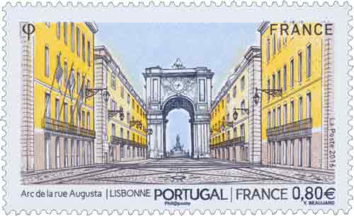 | Commentaire | En savoir plus sur Wikipédia : Arc de triomphe de a rue Augusta la "Rua Augusta" à Lisbonne, fut le joyau du plan de reconstruction imaginé par le marquis de Pombal, après le violent tremblement de terre de 1755 qui ravageât la plus grande partie de la cité - La perspective de cette rue met en valeur l’Arc de triomphe richement sculpté. On y distingue la monumentale horloge qui est le symbole de la puissance du Portugal dans le domaine de l'horlogerie. On retrouve les façades peintes en jaune et le détail des dessins des pavés dans la rue. |