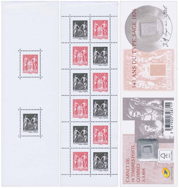 | Description | Carnet de 14 timbres présente 7 timbres type Sage en rouge et 7 timbres illustrés du dessin de Jules Auguste Sage, en brun foncé |