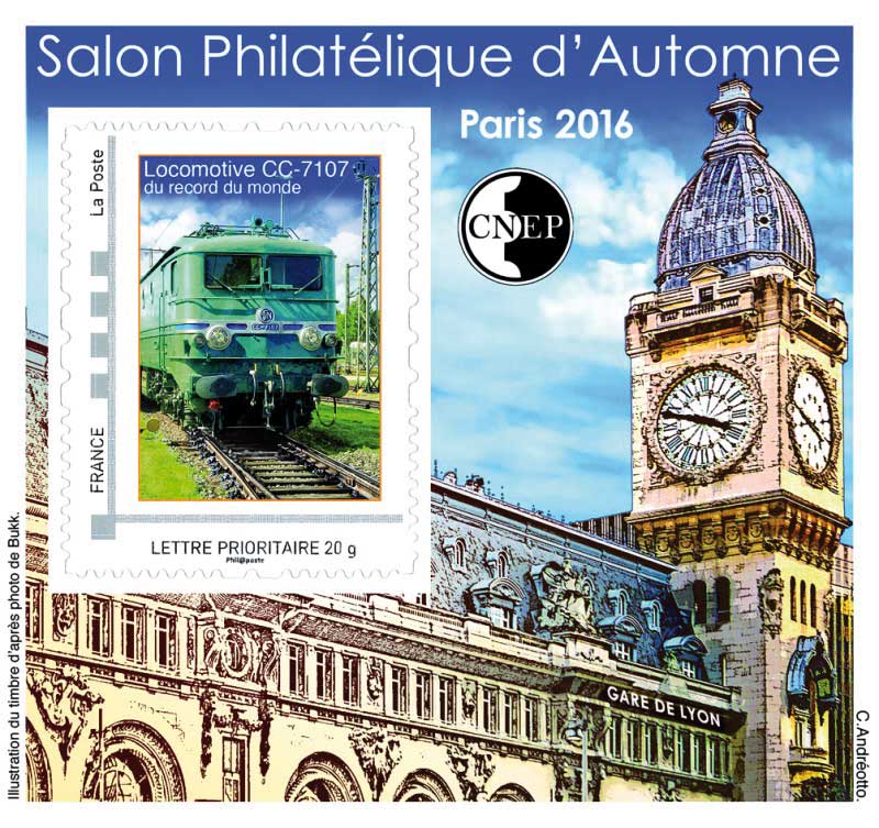 | Description | Représentation de la CC-7107 du record du monde de vitesse sur rail, en fond la gare de Lyon |