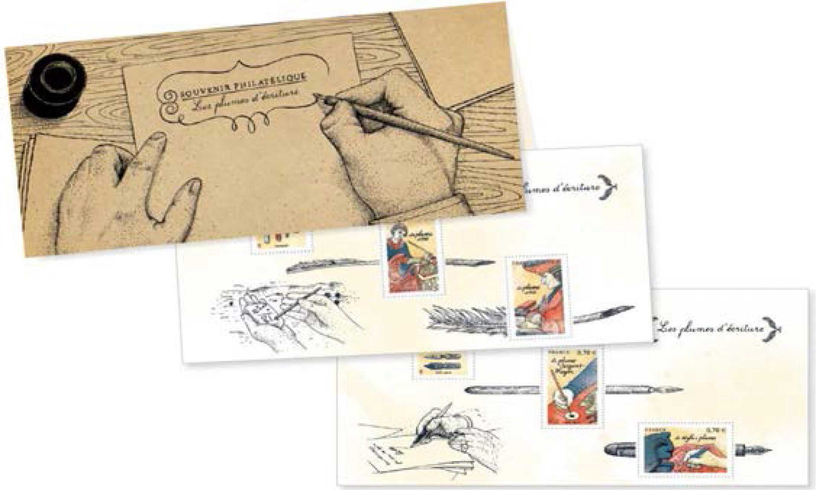 Visuel : l'évocation nostalgique, d'une table avec son encrier et du porte-plume équipé de sa plume Sergent-Major, le tout, permettant la composition écrite du texte : "Souvenir Philatélique, les plumes d'écriture" présenté dans un beau cadre dessiné par la main droite de l'auteur, tandis que la main gauche maintien la feuille..