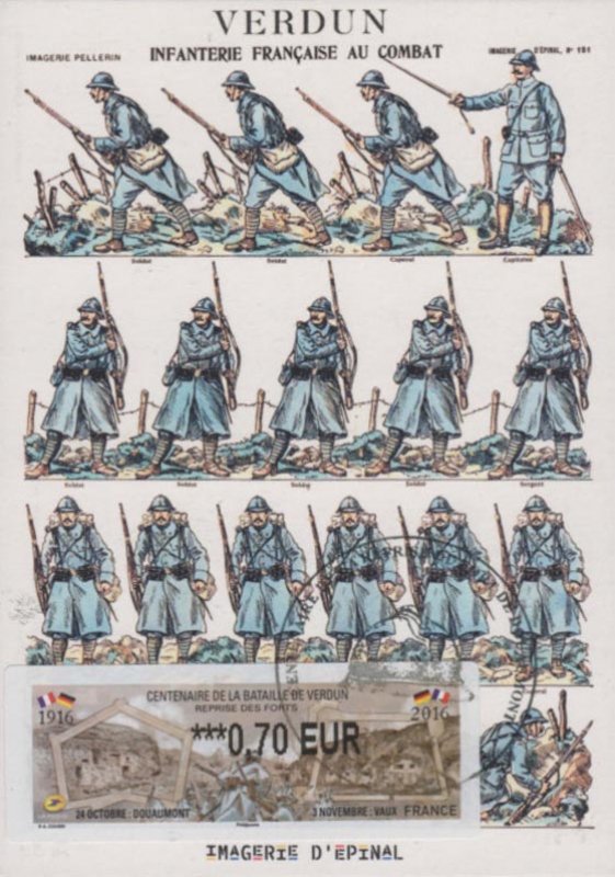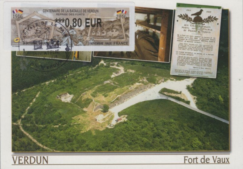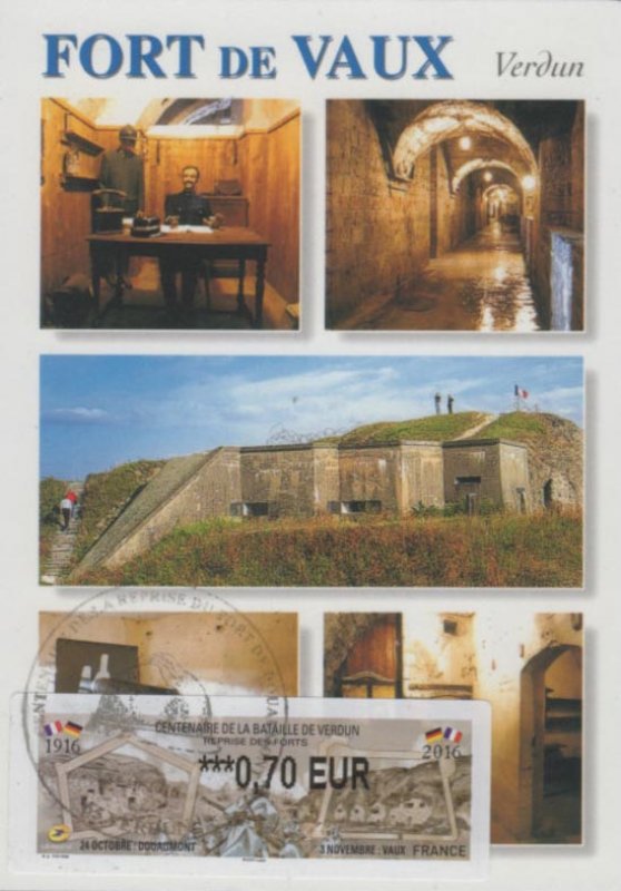 | Commentaire | En savoir plus sur Wikipédia : Fort de Vaux En savoir plus sur Wikipédia : Fort de Douaumont Septembre 1916, le général Joffre demande à Pétain et à Nivelle, de préparer sur la rive droite de la Meuse, la reprise des forts de Vaux et de Douaumont. Le 21 oct. l'artillerie française se prépare à l'offensive. De très nombreuses pièces, dont 20 très gros calibres, opèrent un barrage roulant qui progresse de 100 m toutes les 4 minutes. Aucun abri, aucune voie de communication, aucune tranchée, aucune batterie ennemie n'est épargnée. C'est un déluge de fer et d'acier. Les plus gros obus sont réservés pour les forts de Douaumont et de Vaux qui sont les 2 points stratégiques à reconquérir. Visuel à gauche : image et plan du fort de Douaumont, repris le 24 oct. 1916 au centre : les troupes coloniales françaises, à l'assaut des deux forts à droite : image et plan du fort de Vaux, repris le 3 nov. 1916 |