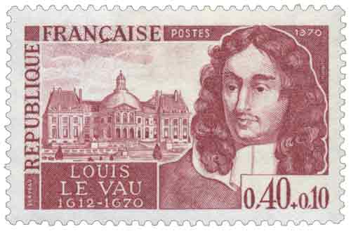 | Commentaire | Émis en 1970, le timbre-poste français consacré à Louis Le Vau rend hommage à l’un des grands architectes du classicisme français à l’occasion du tricentenaire de sa disparition, en illustrant en arrière-plan le château de Vaux-le-Vicomte, œuvre majeure qui symbolise la transition du style Louis XIII finissant vers l’art monumental du règne de Louis XIV ; appartenant aux timbres commémoratifs surtaxés au profit de la Croix-Rouge française, cette émission s’inscrit dans une tradition philatélique associant patrimoine artistique et solidarité, tout en étant destinée à l’affranchissement de la lettre simple pour l’intérieur, la gravure en taille-douce mettant en valeur la rigueur architecturale et l’élégance des lignes caractéristiques de l’œuvre de Le Vau, architecte des grandes résidences parisiennes et royales, directeur des Bâtiments du roi et acteur central des chantiers de Versailles, du Louvre et du Collège des Quatre-Nations, dont l’influence demeure déterminante dans l’histoire de l’architecture française. Article rédigé pour WikiTimbres |