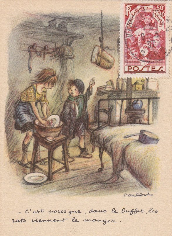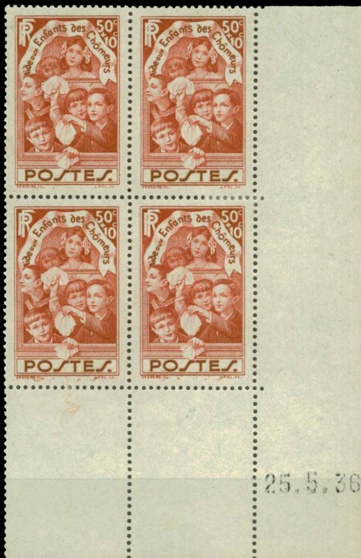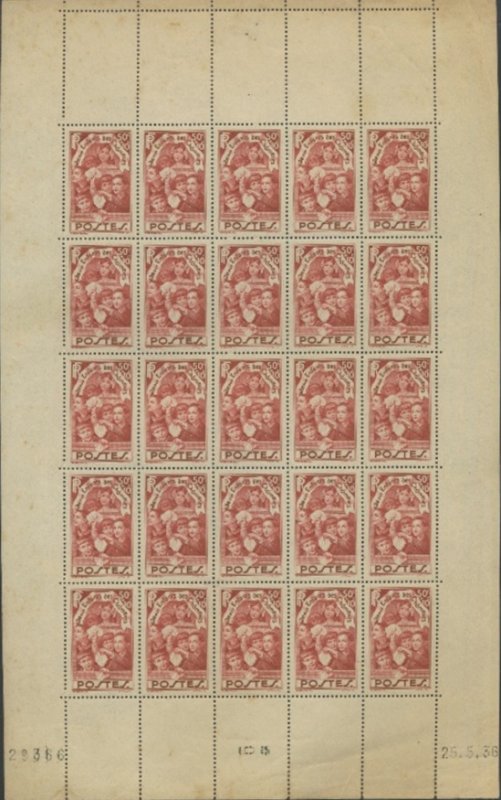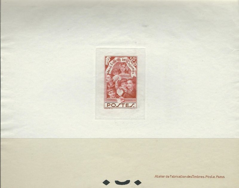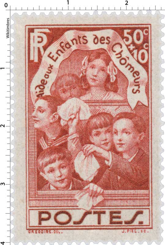 | Commentaire | En 1936 la France traverse le marasme économique de la Grande Dépression. Chômage et pauvreté frappent le pays sans que les gouvernements successifs n'apportent de solutions ; des millions de personnes vivent dans une grande pauvreté, dont des dizaines de milliers d'enfants. C'est pour cette raison que ce timbre a été émis.