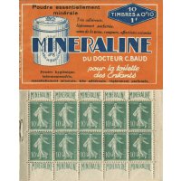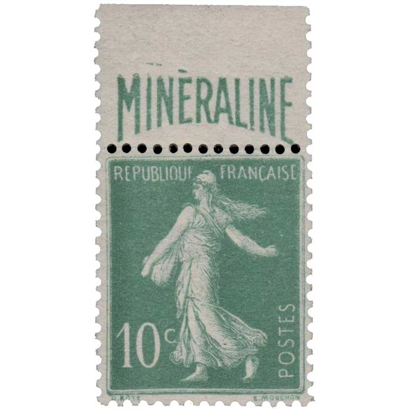 | Commentaire | Semeuse camée chiffres maigres (Minéraline). Voir la vidéo "Histoires de timbres" En savoir plus sur Wikipédia : semeuse camée Émis en juin 1926 et retiré en décembre 1926, ce timbre de 10 centimes appartient à la série des Semeuses fond plein de Louis-Oscar Roty, ici complétée d’une bande publicitaire en marge, caractéristique des tirages promotionnels de l’époque. Gravé par Louis-Eugène Mouchon, il est imprimé en typographie, dentelé 14 × 13½ et présenté au format classique des semeuses (20 × 24 mm). La couleur vert correspond au tarif courant pour les imprimés et petites correspondances. Ces émissions avec bande publicitaire étaient produites en feuilles de 100, chaque bande portant une annonce commerciale destinée aux marges inférieures. |
