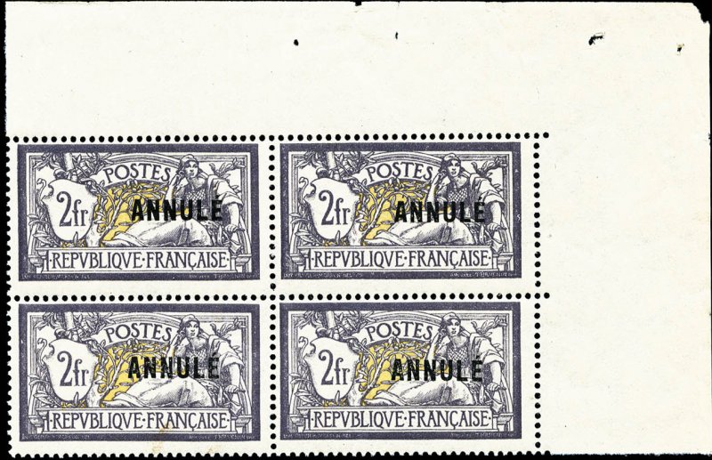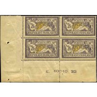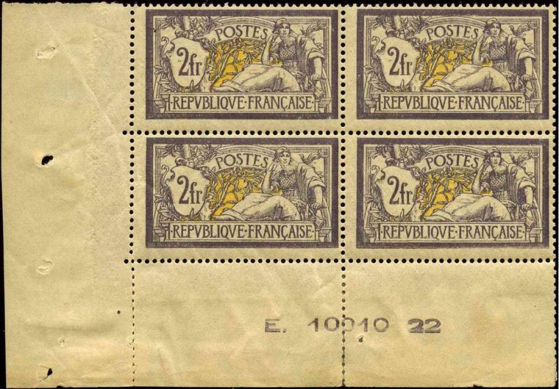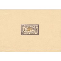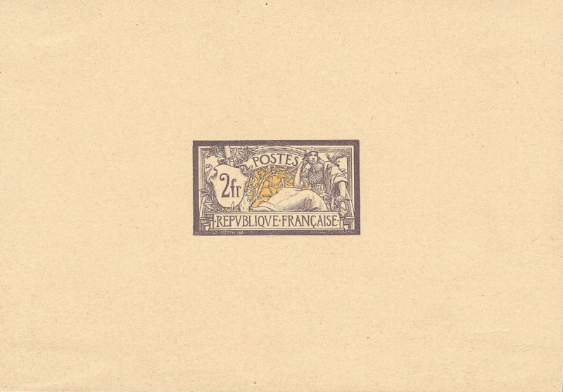 | Commentaire | Émis lors de la vente générale du 4 décembre 1900, le 2 francs violet et jaune au type Merson (YT n°122) constitue l’une des plus hautes valeurs faciales des timbres d’usage courant du début du XXᵉ siècle. Destiné principalement aux affranchissements lourds, aux ** plis recommandés de grande valeur** ou aux envois internationaux complexes, il s’agit d’un timbre d’usage réel relativement rare sur documents, ce qui contribue à sa cote élevée, notamment en neuf. Comme toutes les valeurs de la série, le 2 F Merson reprend l’allégorie créée par Luc-Olivier Merson : La République assise, gardienne de la Paix, représentée dans un décor architecturé. La gravure est confiée à Auguste Thévenin, et l'impression en typographie bicolore nécessite deux passages successifs — l’un pour la vignette violette, l’autre pour le cadre jaune. Ce procédé technique, encore imparfaitement maîtrisé en 1900, est responsable d’un grand nombre de variétés, tant dans l’alignement que dans les nuances de teinte (différents violets plus ou moins sombres et jaunes tirant sur l’ocre). Bien que les quantités exactes d’émission ne soient pas connues, les chiffres d'utilisation postale indiquent un tirage nettement inférieur aux valeurs plus courantes de la série. Le timbre est retiré de la vente en décembre 1906, ce qui limite encore davantage sa disponibilité en état neuf avec gomme d’origine. Rares sont les plis complets comportant un 2 F Merson en affranchissement isolé : la plupart apparaissent en affranchissements composés pour colis, valeurs déclarées ou correspondances commerciales internationales. Ces documents sont très recherchés par les spécialistes du type Merson.