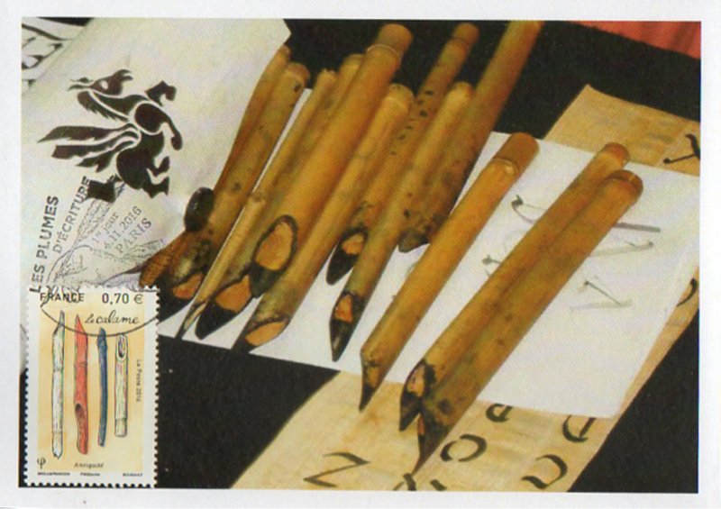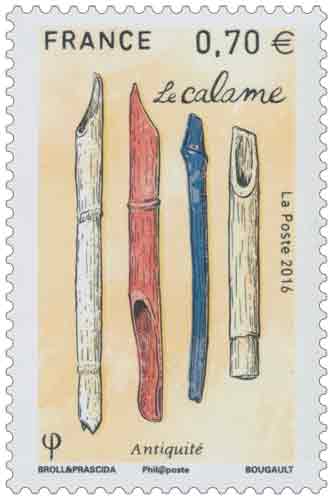 | Commentaire | Le calame : il était le principal outil d'écriture à sec sur des tablettes d'argile, ou trempé dans une encre pour le papyrus, le parchemin ou le papier, durant l'Antiquité classique. C'est une tige creuse, taillée dans la partie supérieure d'un roseau, provenant de roselières de pays tropicaux, ou de bambou. Il est à retailler régulièrement, car l'extrémité du bec en contact avec le papier s'use rapidement. Les calames sont parfois fabriqués en bronze, en os ou en ivoire. |