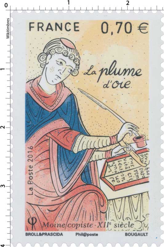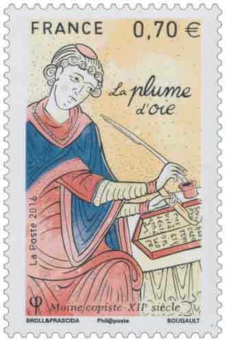 | Commentaire | Moine copiste et plumes d'oie : les moines copistes copiaient des livres à la main pour la population alphabétisée, une faible minorité. Ils travaillaient dans le "scriptorium", ateliers d'écriture des monastères, où les livres étaient copiés, décorés, reliés et conservés. L'armarius dirigeait les travaux et occupait la fonction de bibliothécaire. Un copiste expérimenté pouvait maîtriser plusieurs types d'écriture. Le cas le plus extrême est probablement celui du moine Léonard Wagner, à Augsbourg, mort en 1522, se vantant de savoir tracer soixante-dix sortes d'écriture. On écrit désormais sur du parchemin ("peau de Pergame", Asie mineure, vers 300 après J.-C.), nettement plus solide que le papyrus, puisqu’il est réalisé à partir de peaux d’animaux. Il bénéficie d'autres avantages, le parchemin peut-être confectionné partout, il n'est pas friable et peut se plier, ses deux faces peuvent accueillir textes et décors. Sur ces fines feuilles de chair, les moines recopient des textes religieux et des oeuvres de l’Antiquité. Leurs manuscrits, soigneusement calligraphiés, s’enrichissent d’images raffinées peintes par des artistes de talent : les enluminures. |