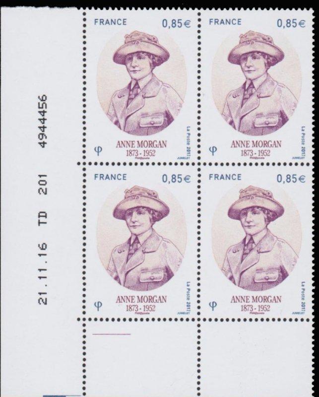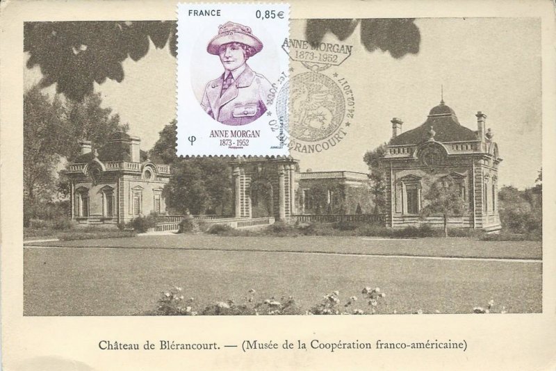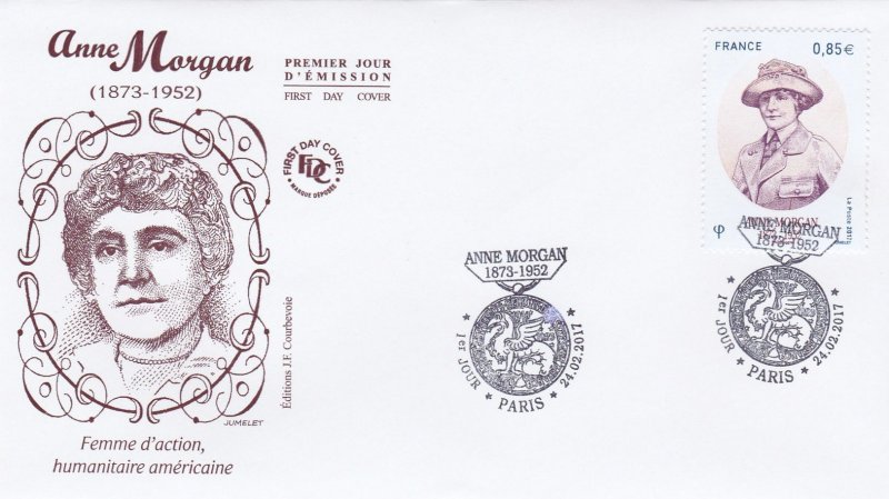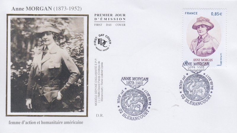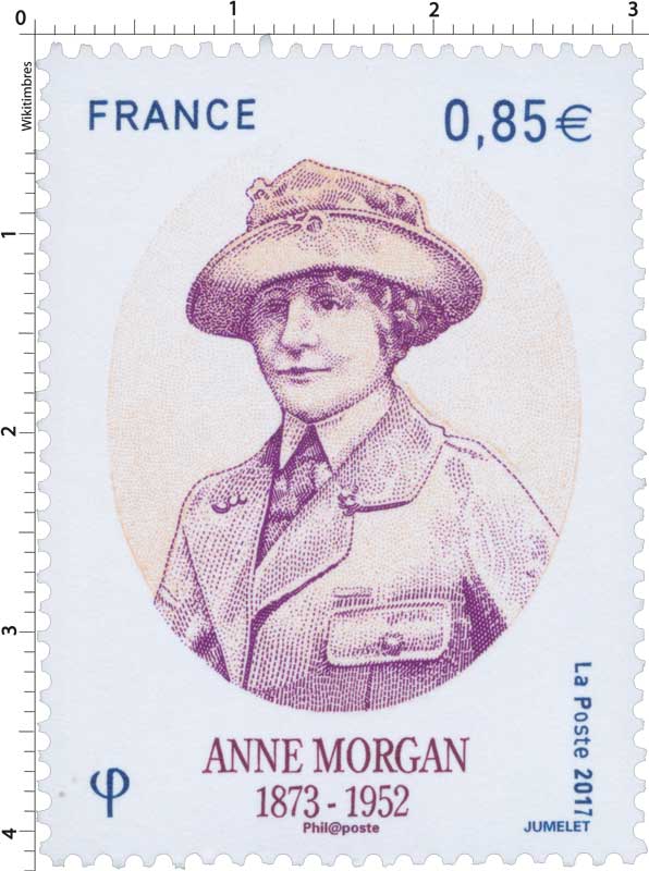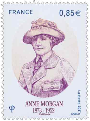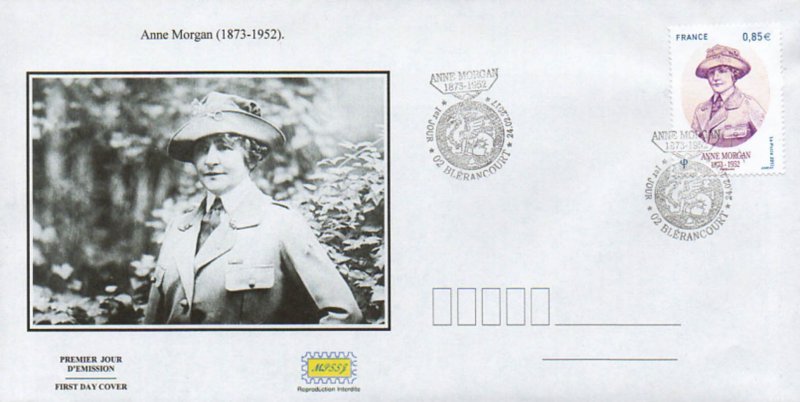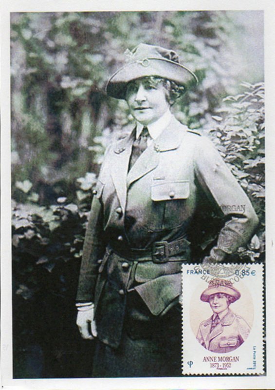 Anne Morgan, née le 25 juillet 1873 à New-York (Etats-Unis), décède le 29 janv.1952 dans l'Etat de New-York. Elle est la fille du richissime homme d'affaires et banquier John Pierpont Morgan, dit J. P. Morgan (1837-1913), et deviendra une grande philanthrope américaine. Anne Morgan est membre fondatrice du Colony Club (New-York, 1903), premier club pour femmes de la ville. Depuis 1907, les américaines Anne Morgan, Elisabeth Marbury et Elsie de Wolfe séjournent à la villa Trianon, près de Versailles. Elles connaissent la haute société américaine à Paris ainsi que la française. Au décès de son père, en 1913, elle est la plus riche héritière au monde. Pour garder son indépendance et sa liberté, elle refuse les nombreuses demandes en mariage. Première Guerre mondiale en Europe, 1914-1918 : de nombreux volontaires américains tr versent l’Atl ntique pour venir en aide aux alliés engagés dans le conflit. Sept. 1914, Anne Morgan et ses amies se rendent sur le champ de bataille de la Marne. Elles en font un récit pour leurs compatriotes, puis rentrent aux Etats-Unis pour commencer à collecter des fonds pour les victimes européennes de la guerre. Avec Elizabeth Lathrop, elles fondent l'American Fund for French Wounded (AFFW), dont elle devient la trésorière. Cette association fournit les hôpitaux et les ambulances en matériel médical et envoie des colis aux soldats du front.