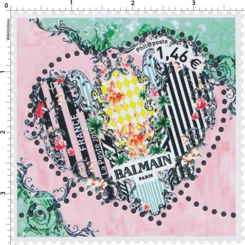 | Description | Timbre Coeur Balmain à 1.46 € - La Maison Balmain a été fondée en 1946 par Pierre Balmain (1914 - 1982), couturier français né à Saint-Jean-de-Maurienne |