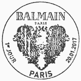 Timbre à date “Premier Jour” conçu par Balmain Mise en page Aurélie Baras
