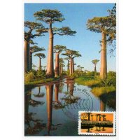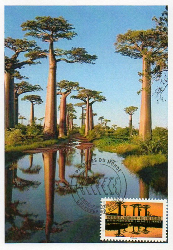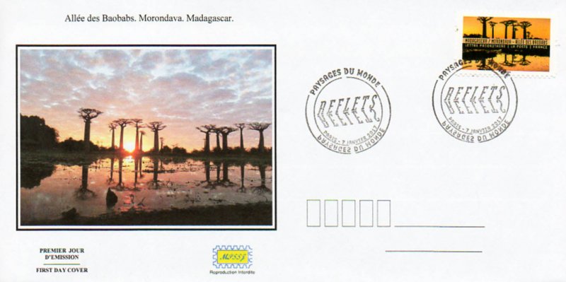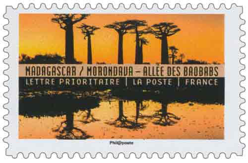 MADAGASCAR - MORONDAVA – ALLEES des BAOBABS - photo : © Montico Lionel / hemis.fr Visuel : Les baobabs et leur reflet sur l'eau des marécages (anciennes rizières en cours d'assèchement) L'allée des baobabs (environ 400 m), est un groupe de baobabs qui bordent la route terrestre entre Morondava (Ouest du pays - capitale économique du Ménabé, province de Tuléar) et Belon'i Tsiribihina (dans la même région). De nombreux arbres gigantesques de 30 m de haut et de Ø 7,5 m, de l'espèce "Baobab de Grandidier" (Adansonia grandidieri), endémique de Madagascar, bordent cette avenue traversant des marécages envahis de jacinthes mauves. Les baobabs (les "Racines du Ciel", vieux de plus de 800 ans, connus localement sous le nom de "renala" (en malgache pour "mère de la forêt"), sont un héritage des forêts tropicales denses qui ont prospéré à Madagascar. Les baobabs (environ 313) n'ont pas grandi isolément dans ce paysage sec et broussailleux, mais ont fait partie d'une forêt dense aujourd'hui disparue (il ne reste plus que 10 forêts primaires aujourd'hui dans le pays). L'espèce est classée en danger d'extinction sur la liste rouge de l'UICN (Union internationale pour la conservation de la nature) et c'est une zone protégée de 320 ha, depuis l'année 2007.