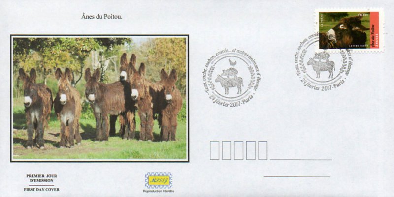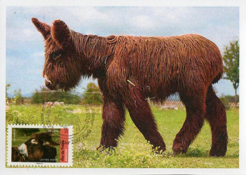 Âne du Poitou - Ânesse © J.-L. Klein et ML. Hubert / Naturagency : une race très ancienne ori inaire de l’Ouest, plus précisément des départements de : Vendée (85), Deux-Sèvres (79), Vienne (86), Charente-Maritime (17) et Charente (16). Très facilement reconnaissable par son pelage caractéristique d'une longueur peu commune chez un équidé, c’est un âne de rande taille avec une forte ossature. Sa sélection s’est faite au cours des siècles dans une optique unique de production de mulets (engendré par un âne et une jument), activité très lucrative pour la ré ion jusqu’au milieu du XXe siècle. Menacé de disparition faute de débouc és, il fait l’objet de plusieurs plans de sauve arde. Si sa reconversion au bât et l’attela e est réelle, il reste avant tout, emblématique de la ré ion. Description physique : tailles – femelle : 1,35 m à 1,45 m – mâle : 1,40 m à 1,50 m. Il possède une forte structure osseuse et pèse de 350 kg à 450 kg. La tête est longue et grosse. Ses oreilles sont bien ouvertes, garnies de poils longs et peuvent être longues de près de 34 cm. L'encolure est forte, le garrot peu prononcé et le dos droit et long. L'épaule est droite. Le sternum apparaît saillant et les côtes rondes. Son rein est bien attaché, les hanches peu saillantes et sa croupe est courte. Les membres sont forts avec des articulations larges. Le pied est également large et bien ouvert. Sa robe est uniformément bai brun foncé à presque noire, avec le contour des yeux, le nez, le museau argenté bordé d'une auréole rougeâtre. Le ventre et l'intérieur des cuisses sont très clairs. Il est reconnaissable par ses longs poils épais qui s'emmêlent naturellement en poussant pour former des "guenilles". Ses longues mèches frisées sont appelées des "cadenettes". Elles le protègent aussi bien du chaud l'été que du froid l'hiver.