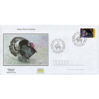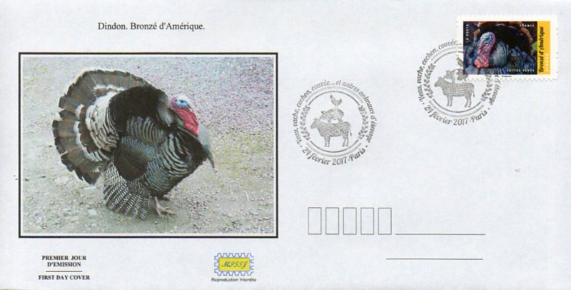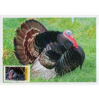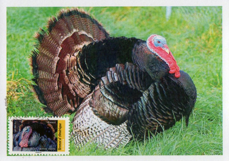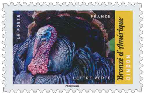 Bronzé d'Amérique - Dindon (ou "mammouth bronzé") © J.-L. Klein et ML. Hubert / Naturagency : c'est un dindon originaire d'Amérique et introduit en Europe. Cette race a été croisée avec plusieurs races françaises afin d'augmenter leur taille, faisant d'elle la plus lourde des volailles domestiques françaises. Description physique : cette race de grande taille, est appréciée pour sa viande et ses oeufs. Poids – dinde : 7 à 9 kg – dindon : 13 à 17 kg. La dinde est une bonne couveuse. Le dindon est fort. Son oeil est brun noisette. Le pluma e offre un ensemble de teintes vraiment a réable voir. Du cou au milieu du dos, il est d'un beau bronzé cuivré ; chaque plume se termine par une bande noire étroite qui la traverse. Du milieu du dos aux plumes de couverture de la queue, chaque plume est noire bordée de bronze cuivré. La poitrine est couleur bronze cuivré. Le cou et les cuisses portent des plumes noires qui se terminent par une bande cuivrée plus sombre, presque noire, bordée d'un liseré blanc. Les plumes du corps sont noires bordées de bronze. Le dessus des ailes, d'un beau bronze cuivré avec des reflets verts. Les rémiges primaires (grandes plumes, ou pennes, des ailes) sont barrées de bandes noires et blanches. Les rémiges secondaires sont noires ou brun foncé, également barrées de blanc et de noir. Les plumes de couverture sont d'un beau vert cuivré et se terminent par une large bande noire formant, lorsque les ailes sont repliées, une large bande d'un bronze foncé. La queue est d'un noir mat; chaque plume est marquée transver-salement par des bandes parallèles de brun, se terminant par une large bande noire bordée d'un large liseré blanc. Les cuisses sont épaisses et coloriées, comme la poitrine, d'une teinte moins brillante, les tarses sont roses, couleur chair chez les adultes, noir chez les jeunes. Chez la femelle, le liseré extérieur blanc des plumes est plus fin que chez le mâle.