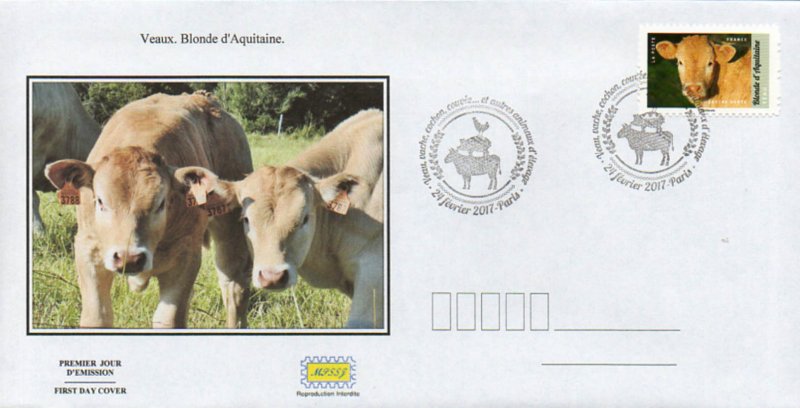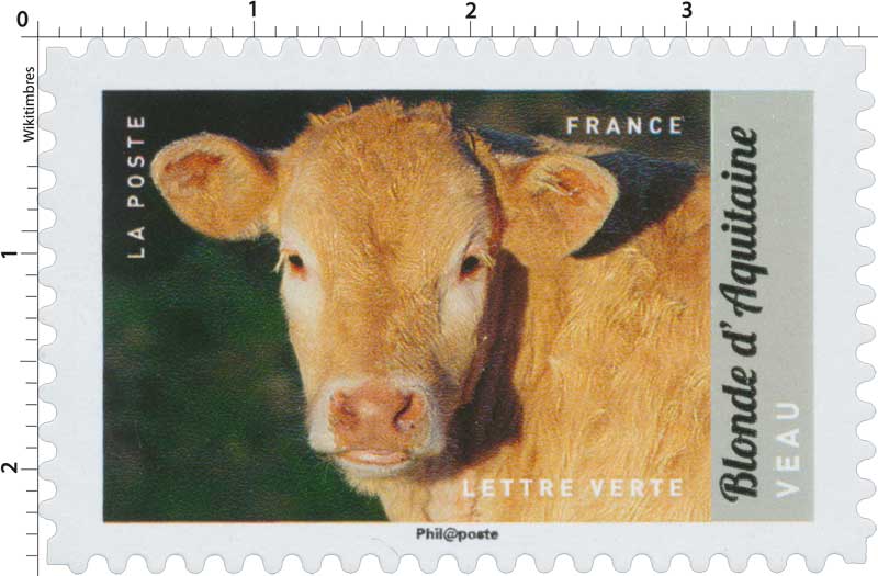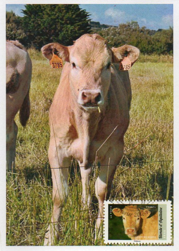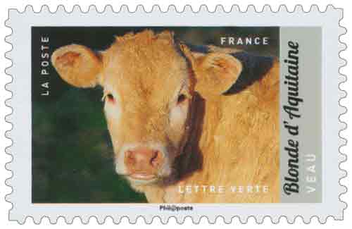 Blonde d'Aquitaine – Veau © Hélène et Michel Sotto / Biosphoto : c'est une race bovine allaitante de grande taille, d'une couleur unie allant selon les individus du froment au blanc crème, aux muqueuses roses. Elle est issue de la fusion en 1962 de trois rameaux bovins du Sud-Ouest de la France. D'un fort développement musculaire, elle est réputée pour ses qualités bouchères, avec une forte proportion de viande, tendre et peu grasse, par rapport au poids total. C'est la troisième race bovine allaitante française en termes d'effectifs. Description physique : sa robe fine de couleur froment allant du clair au foncé variant en fonction de l'âge et de la saison, possède des muqueuses claires, des cornes blanches à l'extrémité foncée, légères, en roue basse ou en lyre. Taille et poids - vache : 1,55 m pour 900 à 1000 kg – taureau : 1,65 m pour 1400 à 1500 kg) - une viande rouge, maigre, compacte, tendre, mais avec peu de goût.