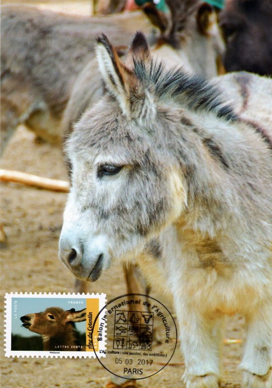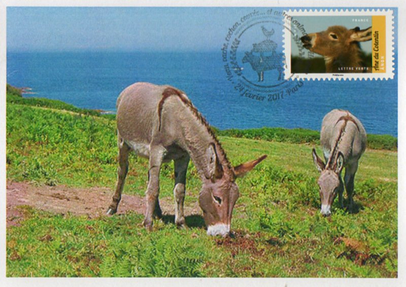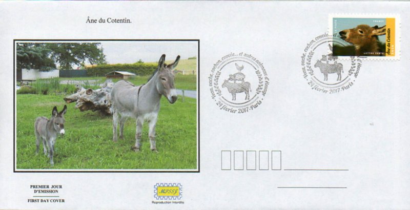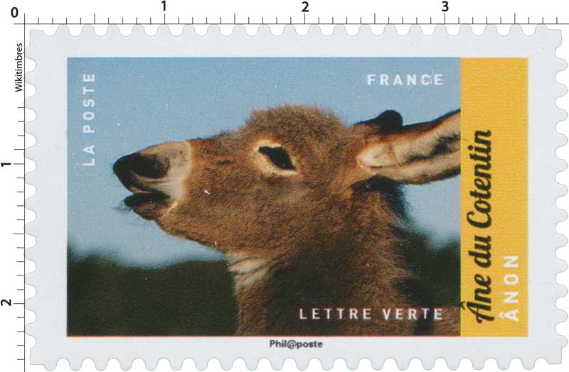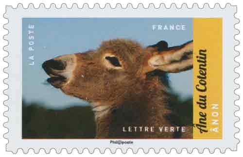 Âne du Cotentin – Ânon © J.-L. Klein et ML. Hubert / Naturagency : une race originaire du département de la Manche (50). C'est un âne de taille moyenne dont la robe grise caracté-ristique présente une bande cruciale, dite "croix de Saint-André ". Longtemps utilisé comme animal de bât (port de lourdes charges) dans les exploitations agricoles, notamment dans le transport des bidons de lait, il sert de nos jours aux activités de loisirs et de tourisme. La race a été reconnue par le Ministère de l’A riculture en 1997. L'élevage est principalement centré en Normandie, son berceau d'origine, mais il est également présent dans d'autres départements. Description physique : tailles – femelle : 1,15 m à 1,30 m – mâle : 1,20 m à 1,35 m. Sa tête est rectiligne, bien attac ée sur l'encolure. L'oeil est vif et les arcades bien marquées. Les oreilles sont de bonne dimension et représentent la moitié de la longueur faciale. Elles sont bien ouvertes, leur pourtour et leur base étant plus foncés. L'encolure est forte et la crinière droite. Son poitrail est bien ouvert et le dos est droit. La croupe est ronde. Les membres sont solides et les aplombs affirmés. Sa robe est gris tourterelle, avec des nuances allant du gris cendré au gris bleuté, et complétée d'une raie cruciale dite "croix de Saint-André". Son ventre est gris-blanc, tout comme le pourtour de son oeil, pouvant également aller sur le roux. Des zébrures peuvent être présentes sur les membres. La race est réputé pour sa docilité au travail, son calme et son affection.