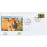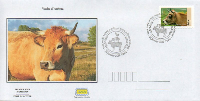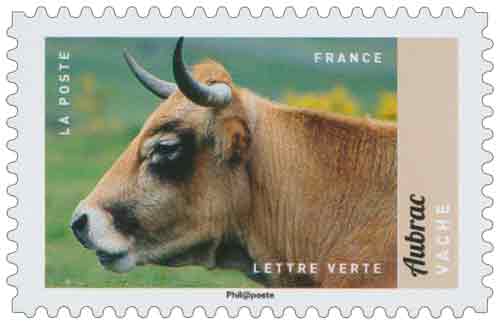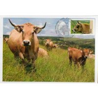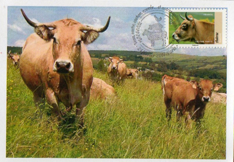 Aubrac – Vache © Gilles Cornière / Biosphoto : c'est une race bovine originaire du haut plateau volcanique et granitique de l'Aubrac (Centre-Sud du Massif Central). Race allaitante destinée à produire de la viande. Autrefois utilisée pour le travail, le lait et la viande, de nos jours, on l'apprécie notamment pour sa rusticité et ses qualités maternelles, qui lui permettent d'élever facilement ses veaux. Description physique : une vache de taille moyenne, à la robe fauve avec les muqueuses, le toupet de la queue, le bout des cornes en lyre et le contour des oreilles noirs. Le bassin et les hanches sont développés et plats. La ligne de dos est rectiligne, la poitrine très profonde et les côtes convexes, sur de solides membres. Le mufle, le bord des paupières et les cils sont noirs entourés d’une auréole blanc e. La lan ue est aux 2/3 de couleur ardoisée noire. L’oeil vif est maquillé de noir ( eux d’Andalouse). Le c anfrein est plat et droit. Le front est carré. Le chignon large est souvent crépu. Les oreilles sont de taille moyenne, fines et bordées de poils noirs. Belle et expressive, la tête se termine par un mufle court et large. Taille et poids - vache : 1,20 m pour 550 à 650 kg – taureau : 1,40 m pour 850 à 950 kg).