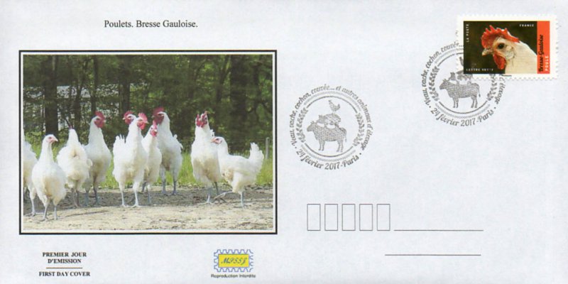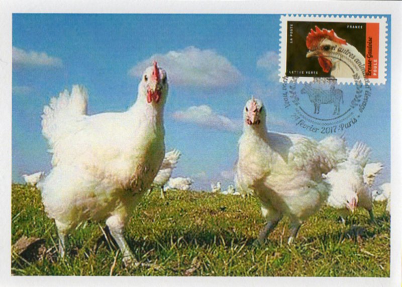Bresse-Gauloise – Poule de Bresse © François Gilson / Biopsphoto : c'est une race française sélectionnée selon le standard de la Société centrale d'aviculture de France (SCAF), afin de concourir dans les expositions nationales et internationales. Dans l'agriculture, la Bresse-gauloise à plumage blanc constitue les cheptels servant à produire le poulet de Bresse. Elle ressemble à sa cousine la Gauloise dorée, mais s'en distingue par une crête tombante rouge, chez la femelle. Il y a 4 variétés de plumage : Blanche (de Bény-Marloz), Noire (de Louhans), Grise (de Bourg) et Bleue. Description physique : poule de type méditerranéen, caractérisé par des oreillons blancs, une ossature fine et une crête simple et régulière. Poids - poule : 2 à 2,5 kg – coq : 2,5 à 3 kg – crête simple, oreillons blancs, yeux noirs, peau blanche, tarses gris ardoises - bagues de Ø : poule : 18 mm – coq : 20 mm
