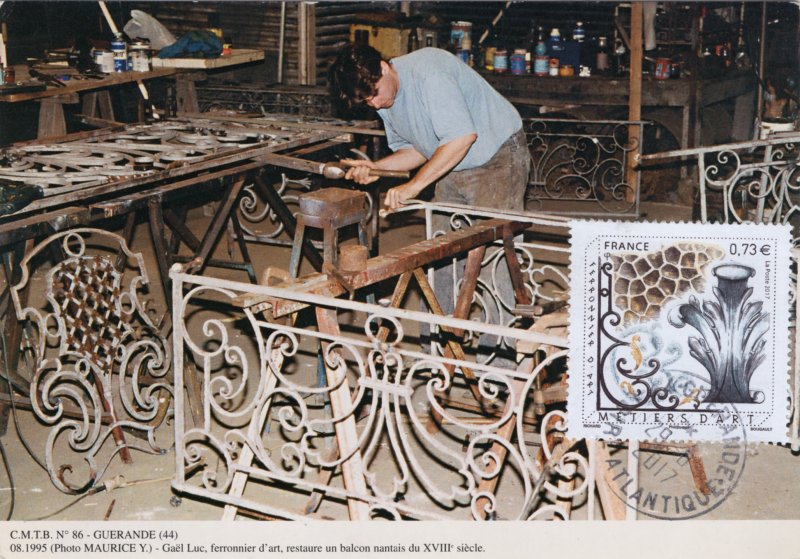 | Commentaire | En savoir plus sur Wikipédia : Ferronnerie Visuel : Une équerre décorative, à volutes traditionnelles, en fer forgé. Le nouveau savoir-faire : un échantillon d'habillage en métal, pour marches et cheminées habillées, de métal texturé et patiné de l’Atelier Steaven Richard. Un motif ornemental : une feuille d'acanthe baroque. De tous les motifs ornementaux empruntés à la nature, la feuille d’acanthe est le plus populaire. Depuis son introduction dans l'architecture grecque, cet ornement est reproduit dans toutes les périodes de style occidentaux. La menuiserie et l'ébénisterie en font également usage depuis la Renaissance, jusqu'au style Louis XVI. Steaven Richard, ferronnier d'art, a imaginé le visuel du TP. Pour illustrer son approche, il explique que "la ferronnerie d'art évoque bien souvent une image très forte" : le forgeron dans l'antre et la chaleur de son atelier, prêt de sa forge et de son enclume. C'est bien évidement le cœur de notre métier. J'ai voulu le dépoussiérer en mettant au point un nouveau savoir-faire à partir d'une machine à texturer que j'ai développé à la demande d'une grande maison de haute-couture. Cette nouvelle technique permet aujourd'hui de réaliser des objets les plus variés (luminaire, mobilier, panneaux décoratifs...) à partir de nos planches de métal texturé que nous découpons, plions, soudons avant de les assembler pour effectuer enfin une finition patinée ". |
