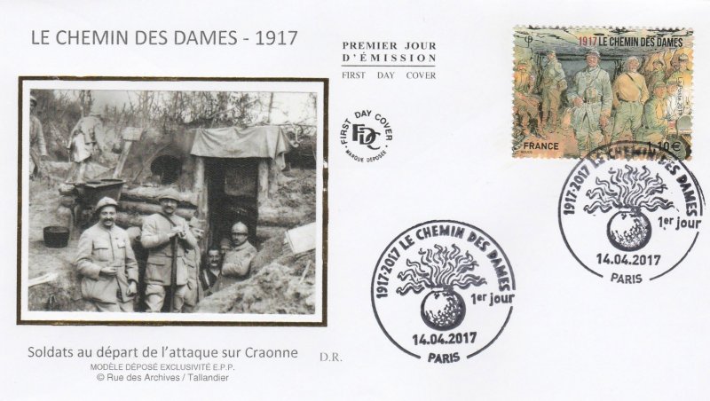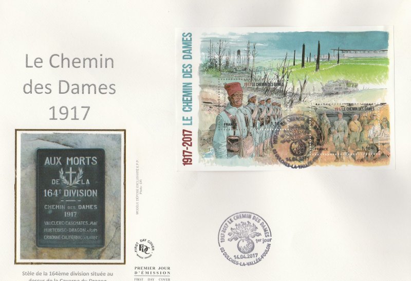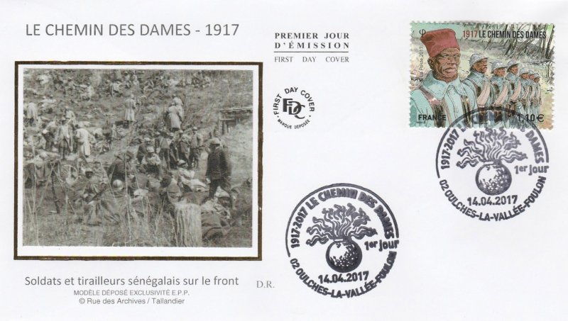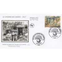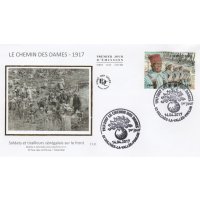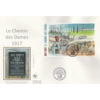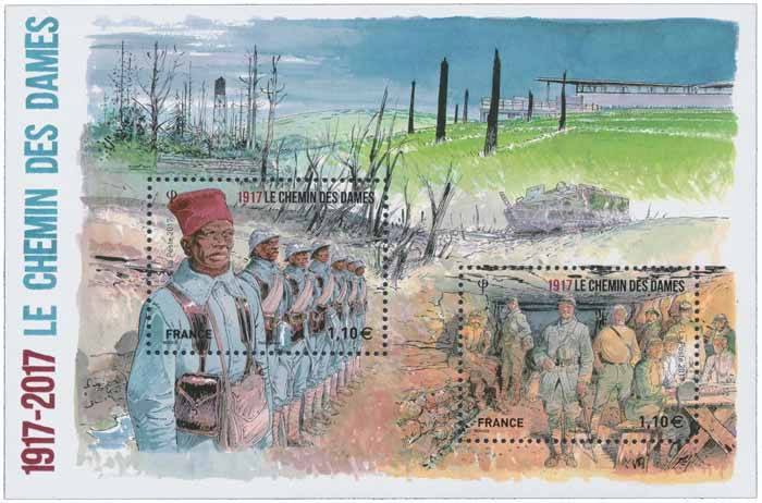 | Commentaire | En savoir plus sur wikpédia : Chemin des Dames Bloc de 2 timbres à 1,10 € Visuel - haut gauche : l'observatoire du Plateau de Californie haut droit : le musée de la Caverne du Dragon et les statues de la "Constellation de la douleur" de Christian Lapie (1955, sculpteur) un ensemble de 9 statues géantes dressées à Oulches-la-Vallée-Foulon (02). TP gauche : les tirailleurs sénégalais qui vont payer un très lourd tribu droite du TP : un char Schneider CA1, l'un des mastodontes d'acier qui, embourbés et en panne, n'ont pas changé l'issue de la bataille TP droit : soldats au repos, dans la Caverne du Dragon. |