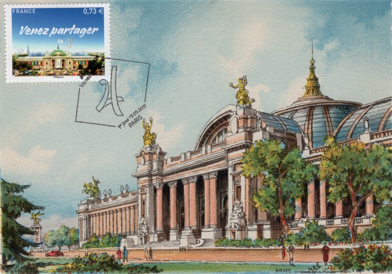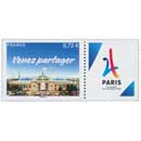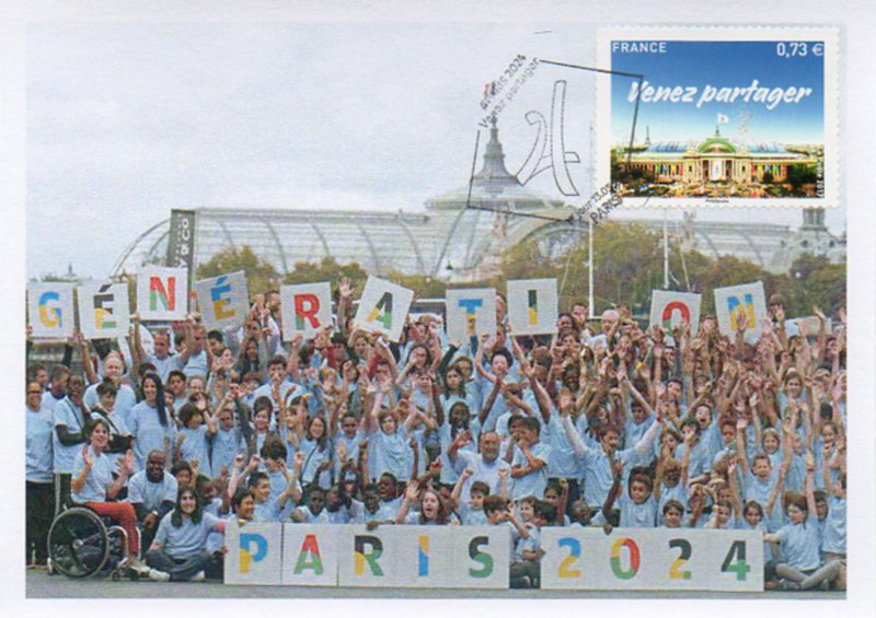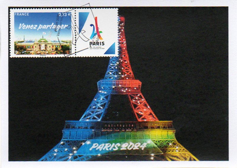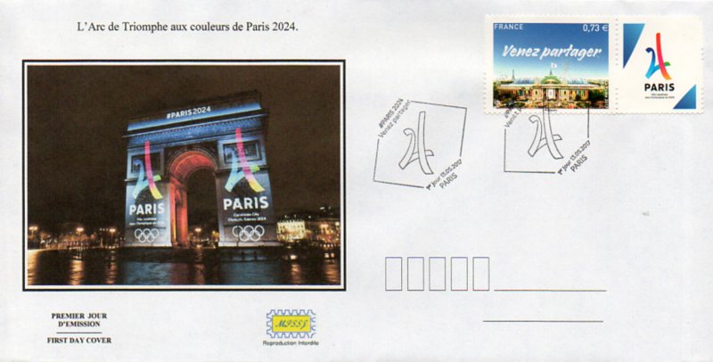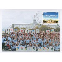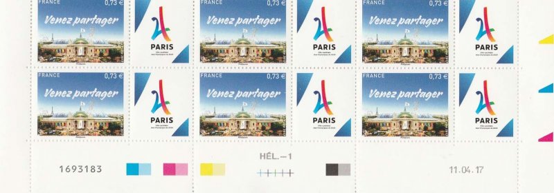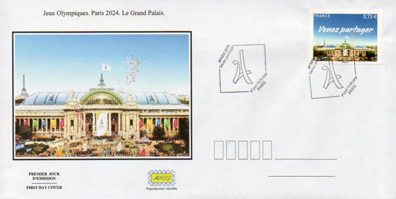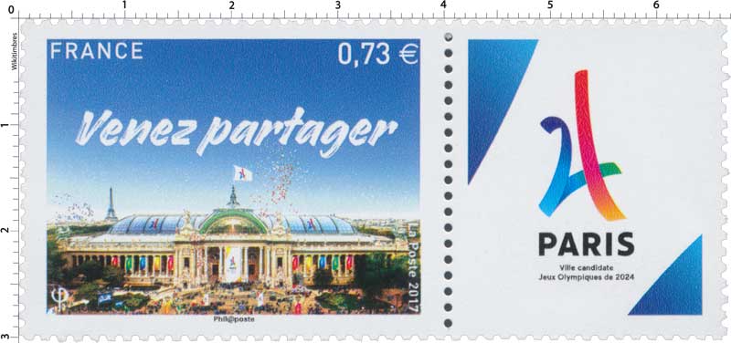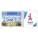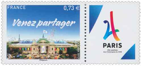 Technique - format innovant : le timbre Paris 2024 est associé à l'application gratuite "Courrier Plus", qui permet de déclencher un contenu en réalité augmentée : "Soutenez la candidature de Paris pour les Jeux Olympiques et Paralympiques de 2024". Grand Palais : sites emblématiques des Jeux, qui accueillera les épreuves d’escrime et de taekwondo en 2024. En fond gauche, la Tour Eiffel, symbole de Paris.
