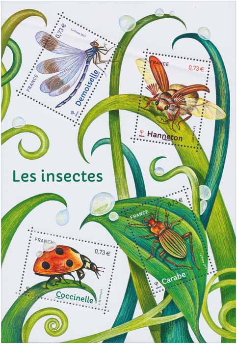 | Commentaire | En savoir plus sur Wikipédia : les insectes Voici un bloc-feuillet sur "les Insectes", précédé par les émissions "Timbres-taxe" (série des "coléoptères"), les "Papillons", les "Abeilles solitaires" et un hommage à l'entomologiste "Jean-Henri FABRE". Cette émission présente trois "insectes auxiliaires", parmi les amis des jardiniers : la coccinelle, l’abeille, la guêpe, le bourdon, la demoiselle (et la libellule), le perce-oreille, le carabe doré, la chrysope, le syrphe, l’aphidius, le staphylin, le cloporte et l’hémérobe. Le quatrième insecte : le hanneton, familier des jardins et des forêts, est un insecte nuisible par les dégâts occasionnés sur les feuillages, mais surtout par sa larve, le "vers blancs", faisant des dégâts considérables aux jardins et aux racines des arbres, surtout les jeunes plantations en milieu ouvert. Le hanneton a été utilisé au milieu du XIXe siècle pour obtenir de l'huile et de la farine. Un chimiste envisageait de l'utiliser pour en extraire une matière colorante de couleur jaune, avec variantes. |