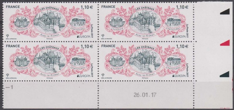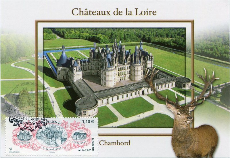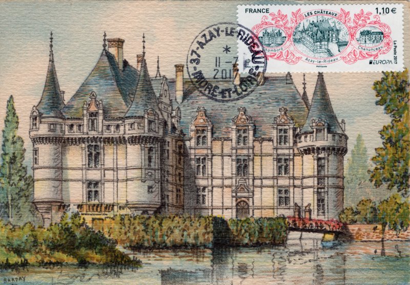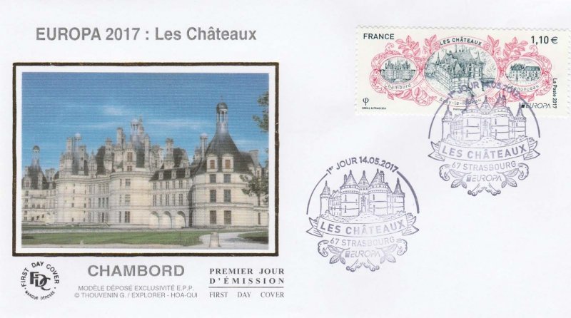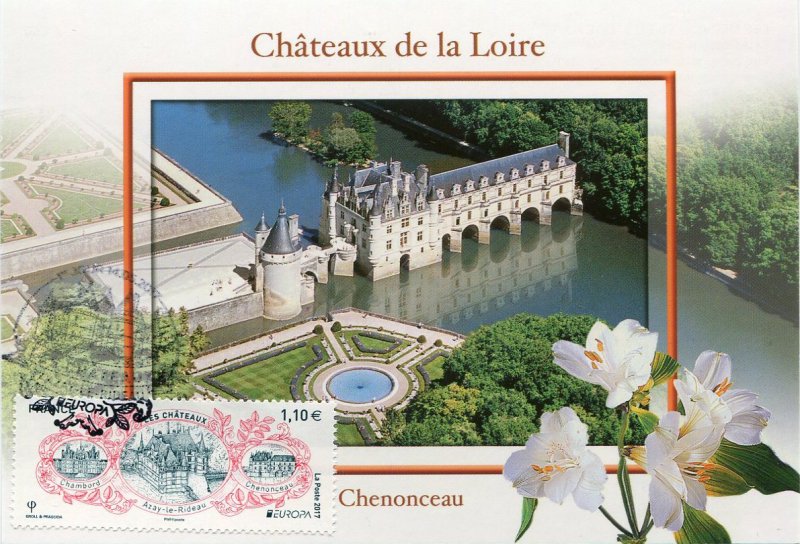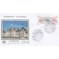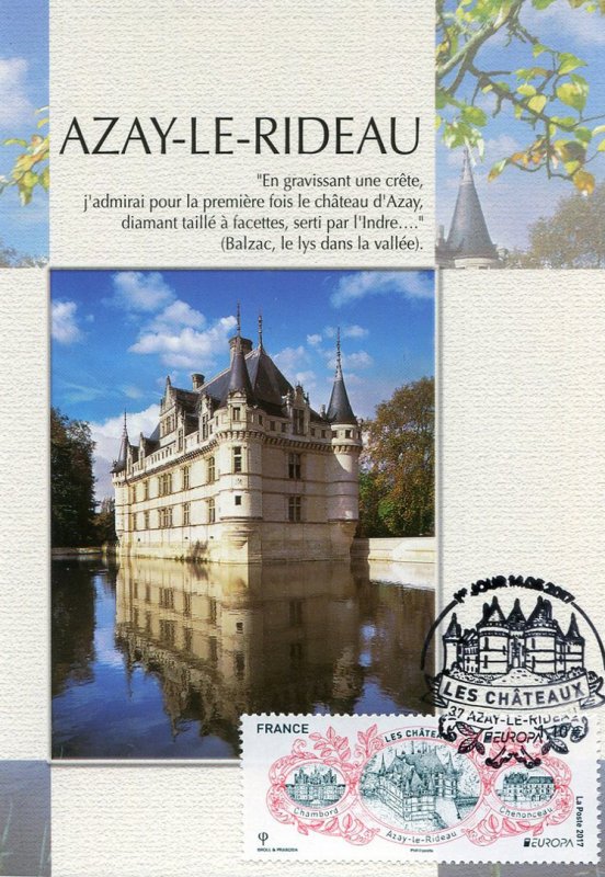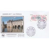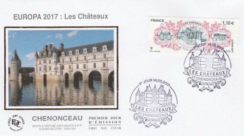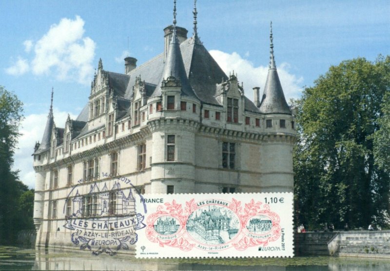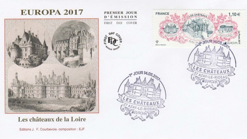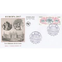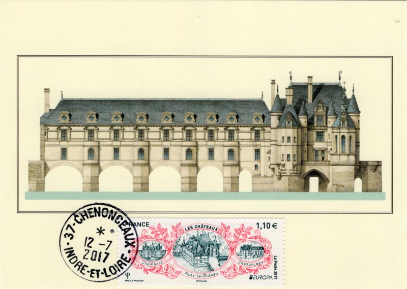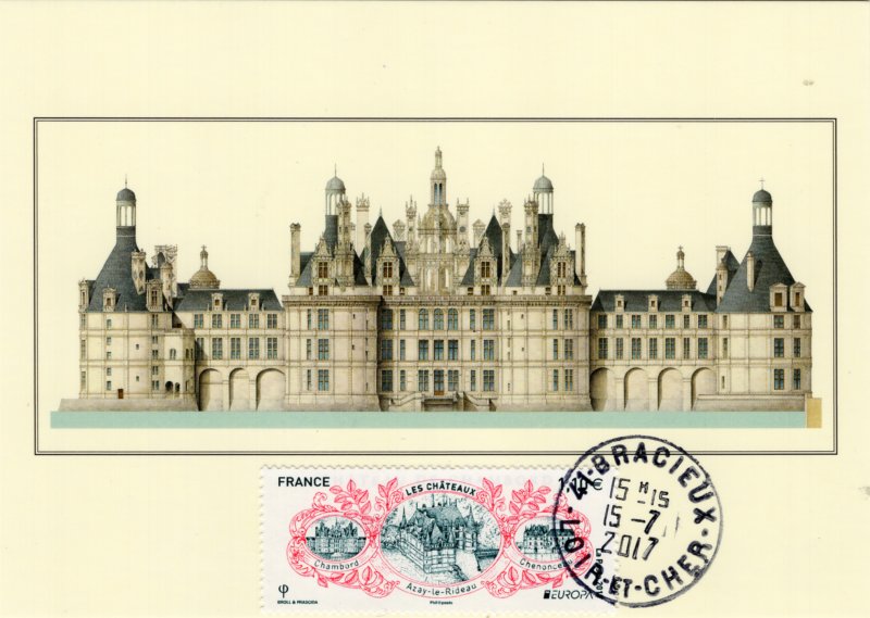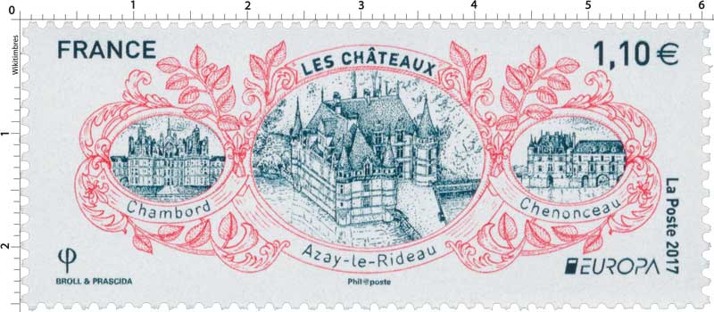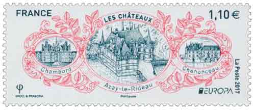 | Commentaire | Technique : crayonné des châteaux, mis en valeur par des ornements originaux, de couleur corail, composés de feuilles d'ormes champêtres, poussant le long de la Loire, de fleurs de lys, symboles des rois de France. Trois châteaux sont mis à l'honneur : Chambord, Azay-le-Rideau et Chenonceau Chaque année depuis 1956, un timbre Europa est émis sur une thématique commune définie par POSTEUROP, association regroupant 52membres dans 49 pays et territoires différents. Chaque pays choisit le visuel du timbre Europa, à partir du thème commun à tous les affiliés. Pour illustrer la thématique EUROPA 2017, Phil@poste a choisi trois châteaux, joyaux de la Renaissance, ayant été édifiés sous le règne du roi François 1er : Chambord (41-Loir-et-Cher), Azay-le-Rideau (37- Indre-et-Loire) et Chenonceau, le "Château des Dames", sur la commune de Chenonceaux (37-Indre-et-Loire). |