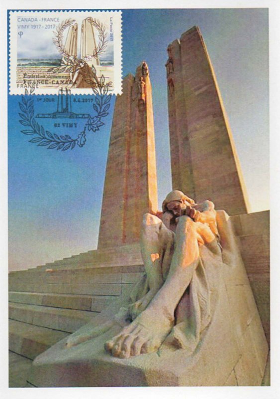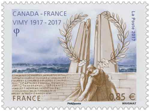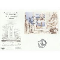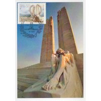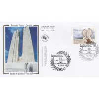 | Commentaire | En savoir plus sur Wikipédia : Bataille de la crête de Vimy Bloc composé de 2 timbres : 0.85 € + 1.30 € Le chœur du mémorial : deux pylônes s’élevant à 27 m de haut et formant comme une "Porte" se franchissant d'Est en Ouest (vers la mer et le Canada). Ils sont ornés de huit statues : deux faisant face à l’Ouest et représentant des femmes ailées et six faisant face à l’Est. Entre les deux pylônes se trouve un groupe de deux hommes, faisant face à l’Est : le premier portant un flambeau se tient derrière le second qui la tête rejetée en arrière, les yeux fermés, le bras droit tendu vers l’autre personnage, bombe le torse dans une posture de sacrifice. Cet ensemble symbolise l’esprit de sacrifice transmettant le flambeau à un camarade et fait référence a l'un des poèmes les plus célèbres de la Grande Guerre "In Flanders Fields" (Au Champ d'Honneur), rédigé par le lieutenant-colonel John McCrae du Corps médical de l'Armée canadienne. Ces statues représentent toutes des vertus, à l’exception des deux couronnant les pylônes qui représentent des idéaux. La "Porte de l’Eternité" gardée par la Paix et la Justice et que ne franchissent que ceux qui ont fait preuve de vertu durant leur vie, afin d’arriver dans un monde ou ils connaîtront l’illumination |