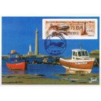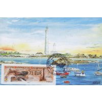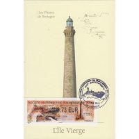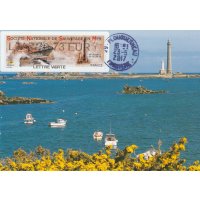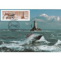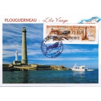 | Commentaire | Visuel : représentation du canot tout temps SNS 064, Président Joseph Oulhen de la station SNSM de l'Aber Wrac'h en intervention, le phare de l'Île Vierge (Enez-Werc'h) et ses coordonnées géographiques, une rose des vents, à sa droite. |
