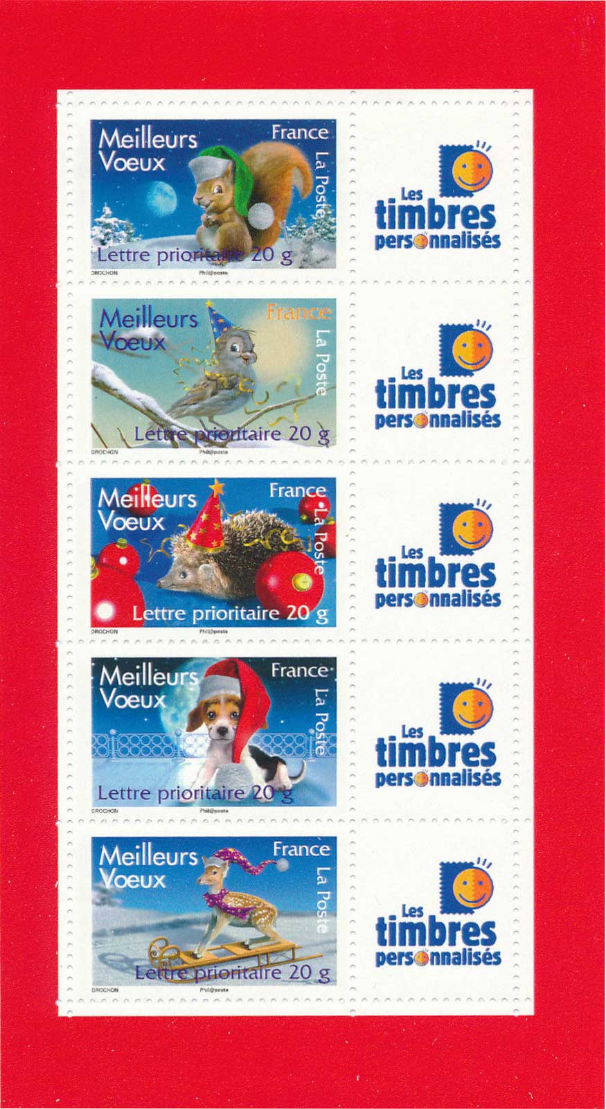 | Commentaire | MEILLEURS VŒUX C’est dans un décor festif de fin d’année – boules, neige et bonnet de Noël - que de nouveaux animaux, tendres et attachants et toujours en 3 D, transmettront nos « meilleurs vœux 2008 » - un chien, un hérisson, un faon, un oiseau et un écureuil. Timbre sans millésime |