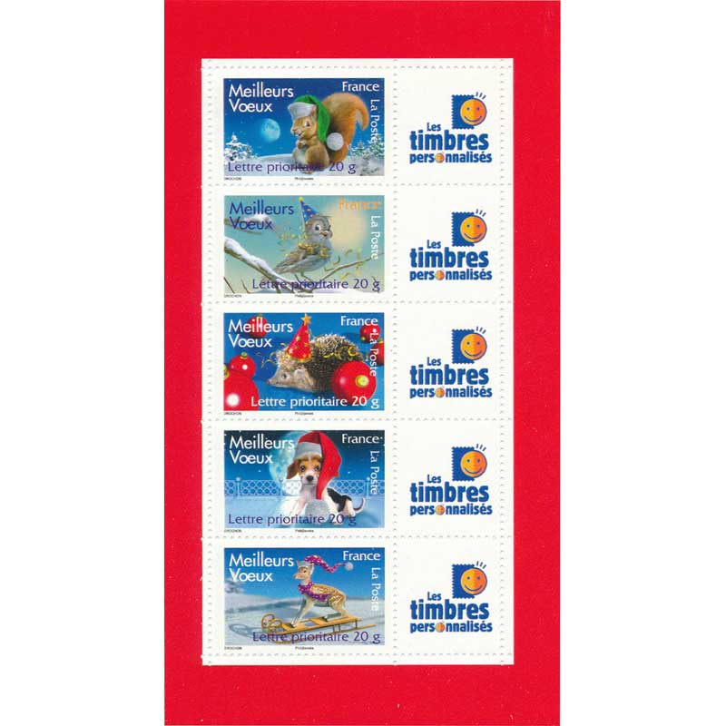 | Commentaire | MEILLEURS VŒUX C’est dans un décor festif de fin d’année – boules, neige et bonnet de Noël - que de nouveaux animaux, tendres et attachants et toujours en 3 D, transmettront nos « meilleurs vœux 2008 » - un chien, un hérisson, un faon, un oiseau et un écureuil. Timbre sans millésime |