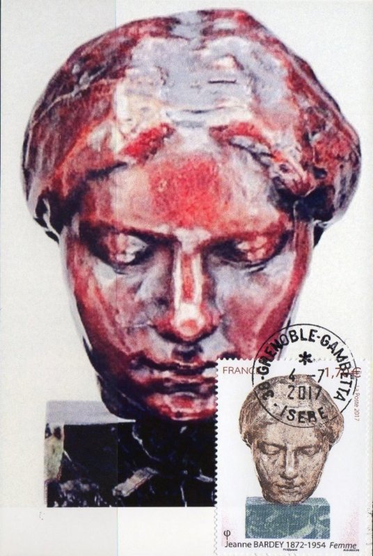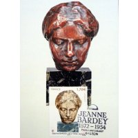 | Commentaire | En savoir plus sur Wikipédia : Jeanne Bardey Jeanne Bardey est née à Lyon le 12 avril 1872, elle est l’un des plus importants sculpteurs lyonnais du 20e siècle, et la dernière élève de Rodin. N’ayant jamais eu besoin d’exposer pour vivre, elle restera une artiste méconnue jusqu’à la fin de sa vie. Ses œuvres sont actuellement conservées au Musée des Arts Décoratifs de Lyon. En savoir plus sur Wikipédia : Musée des Tissus et des Arts décoratifs Visuel : tête de "Femme", socle en marbre vert - Jeanne BARDEY (1872-1954) avant 1914 - sculpture en bronze, tirée d'un plâtre à couture non réparé, ht.85 mm, larg.72 mm, prof.88 mm, avec socle : ht.155 mm |