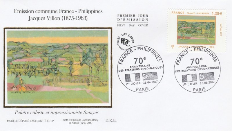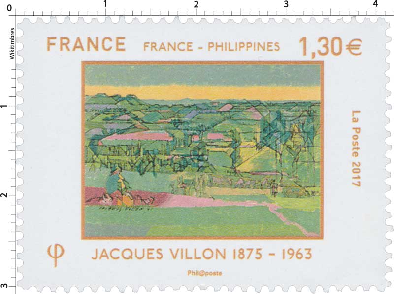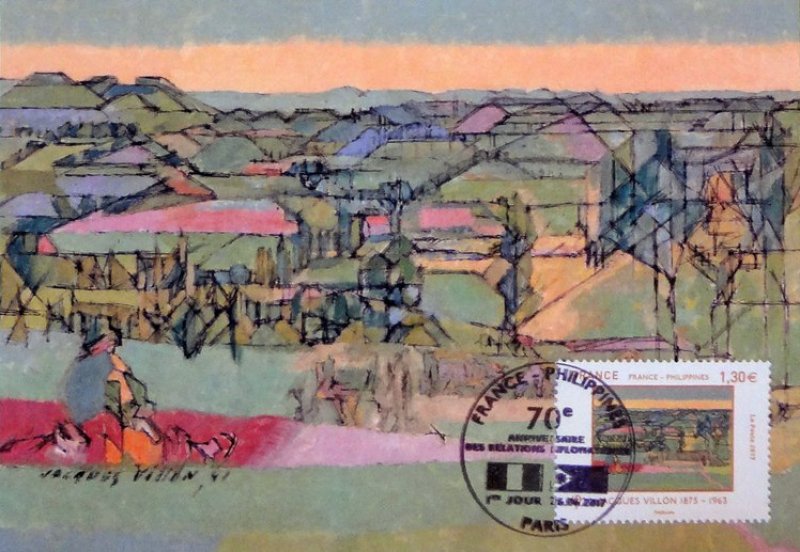 | Description | Émission commune : France - Philippines . Représentation d'une œuvre de Jacques Villon (1875 - 1963) peintre et graveur cubiste français, né à Damville (Eure) |