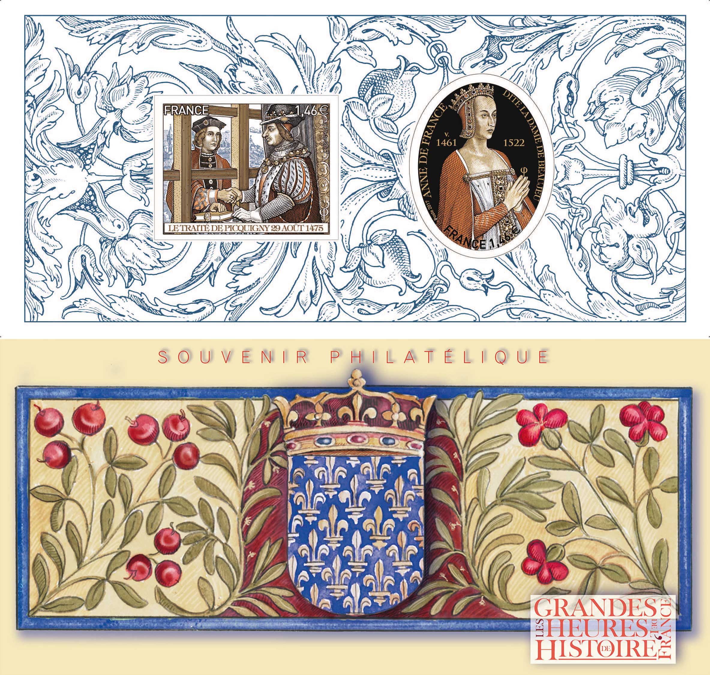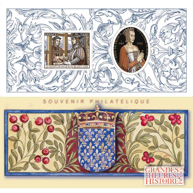 | Commentaire | Visuel : couverture : d'après "Armes de France", avec la couronne royale – blasonnement : avant le XIVe siècle, dit France Ancien - "d'azur semé de fleurs de lys d'or" (sans nombre) Histoire : Sous l'Ancien Régime, les armoiries de la France sont les fleurs de lys d'or sur champ d'azur. Elles sont utilisées sans interruption pendant près de six siècles (1211-1792) : bien que la légende les fasse naître lors du baptême de Clovis Ier (Chlodovechus, v.466 - nov.511 à Paris), qui aurait alors remplacé les trois crapauds qui ornaient son écu, par trois fleurs de lys (lis) mariaux (Trinité Sainte), elles ne sont attestées que depuis le début du XIIIe siècle. D'abord représentées sous forme de semé, c'est-à-dire sans nombre défini et disposées en quinconce, les fleurs de lys sont réduites à trois en 1376 par décision de Charles V, dit Charles le Sage (règne 1364-1380) qui entendait placer le Royaume, sous la double invocation de la Vierge (le lys est un symbole marial), et de la Trinité. Feuillet : un décors de fond, avec la reprise des 2 TP : Traité de Picquigny, 29 août 1475 et Anne de France (avril 1461 à nov.1522), dite la Dame de Beaujeu. |