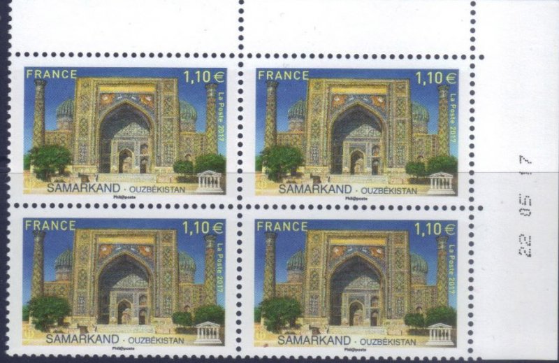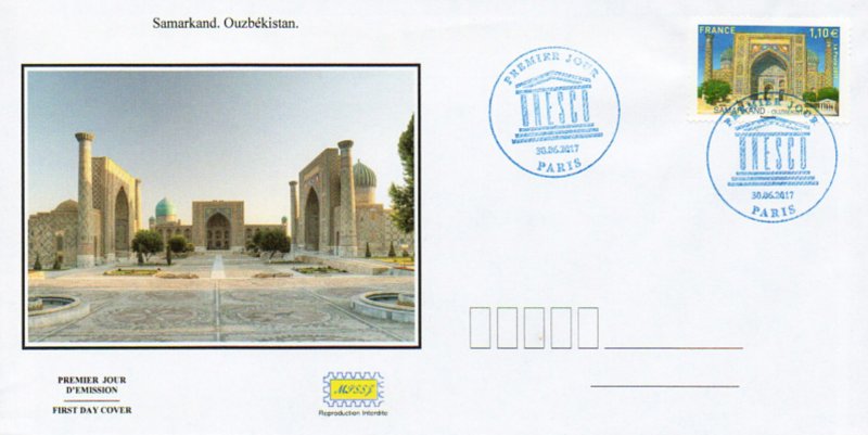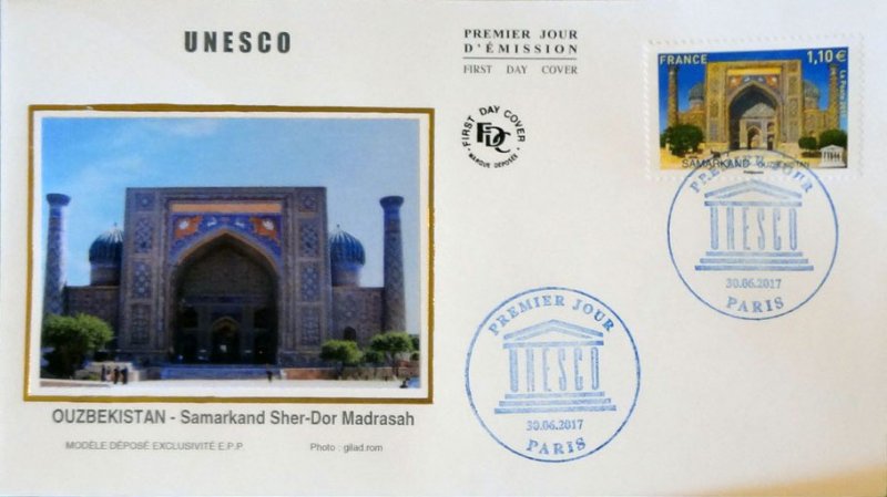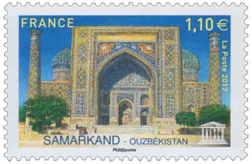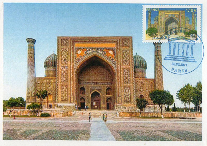 | Commentaire | En savoir plus sur Wikipédia : Samarkande En savoir plus sur Wikipédia : Médersa Cher-Dor Visuel : la "Médersa Cher-Dor" est l'une des 3 médersas, avec celle d'Oulough Beg (1417-1420, une des plus vastes) et celle de Tilla-Qari (Couverte d'or) entourant la place du Régistan (ou Réghistan, "place sablonneuse"). C'est une médersa (ou madrassa), soit une école, laïque ou religieuse, ou une université théologique musulmane, principalement un lieu où l'on étudie le droit. La médersa Cher-Dor ("qui porte des lions", 1619-1635/36) a été construite par l'émir Chaybanadine Yalangtouch (XVIIe siècle), "en miroir" de la médersa d'Oulough Beg, antérieure. Elle a pris la place d'un khanaqah (auberge pour soufis, un ascétique musulman) édifié auparavant par Oulough Beg. Elle est flanquée de minarets d'angle sur un modèle identique à la médersa d'Oulough Beg. Les dômes élancés de part et d'autre du pishtak (portail en forme d'arc, élément architectural persan) permettent de supposer qu'il en était de même, à l'époque, pour son vis-à-vis. L’ensemble du bâtiment s'inspire de la disposition générale de son vis-à-vis, mais on n'y retrouve ni la mosquée, ni les salles disposées à l'arrière. Le pishtak décoré de mosaïques colorées présente un exemple peu fréquent d'art figuratif dans l'islam, avec des fauves chassant des daims, des disques solaires à visage humain. |