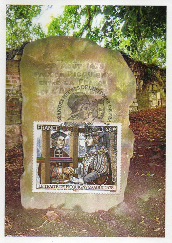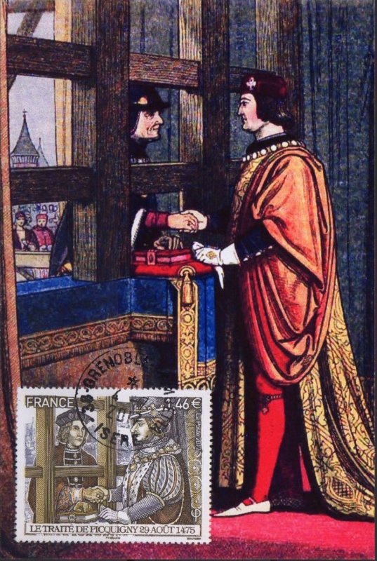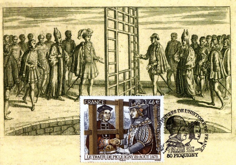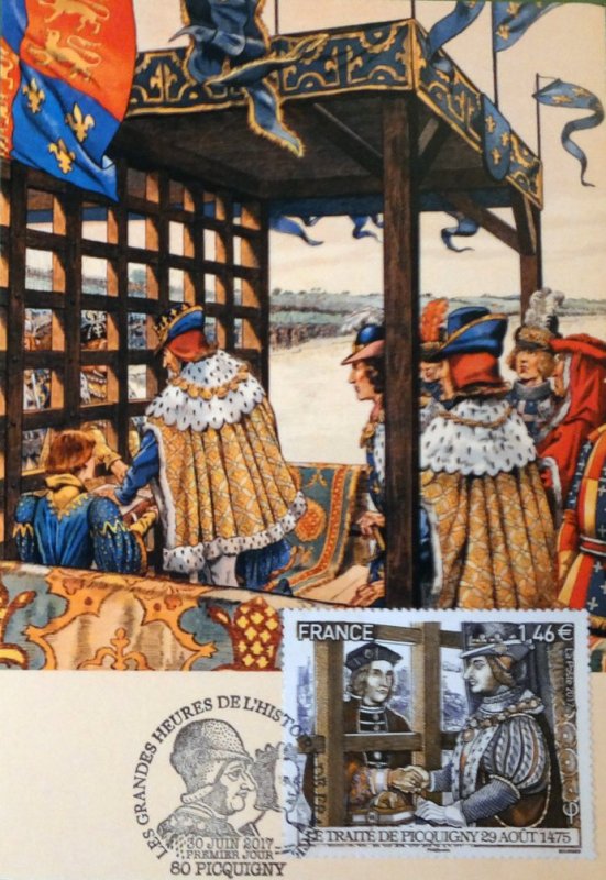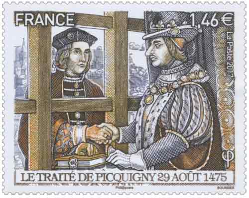 | Description | Provenant du bloc : Les Grandes Heures de l'Histoire de France 2017. Le traité de Picquigny met définitivement fin à la guerre de Cent Ans, signé le 29 août 1475 à Picquigny (Somme) |