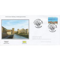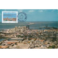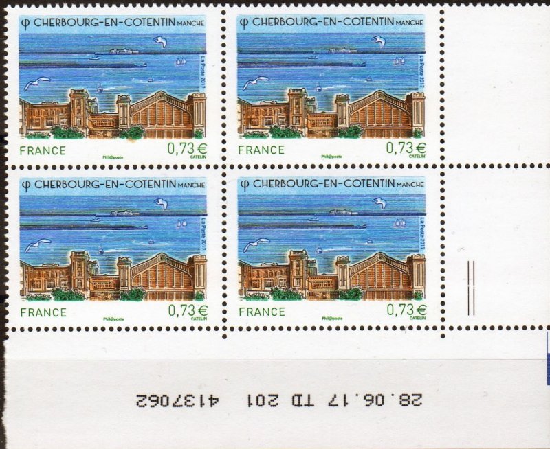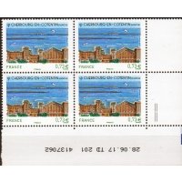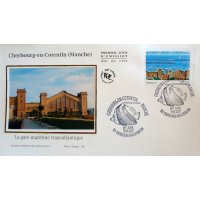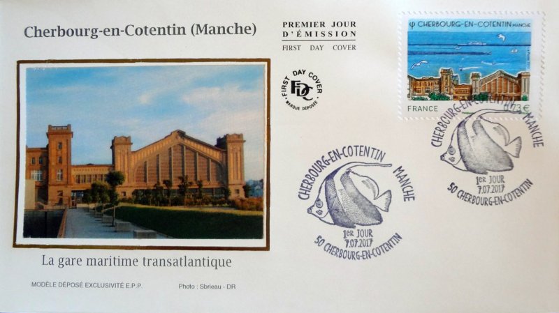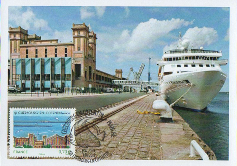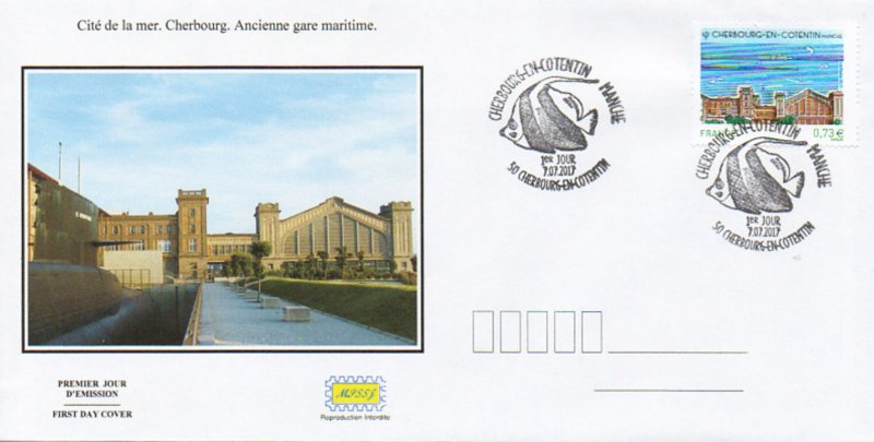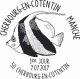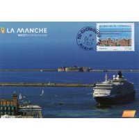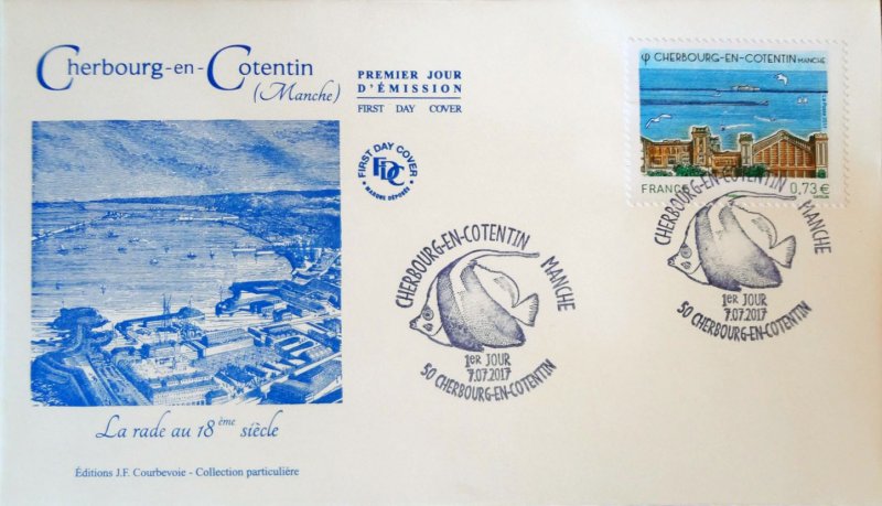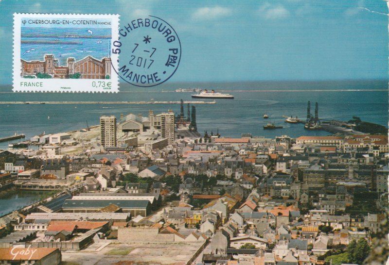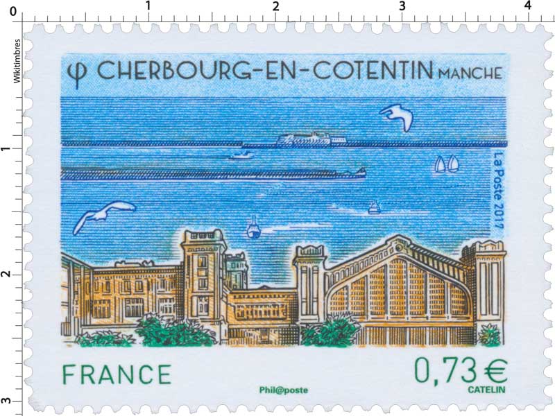 | Commentaire | En savoir plus sur Wikipédia : Cherbourg-en-Cotentin Visuel : sur un fond bleu de la Manche sont représentés, en premier plan, le bâtiment de la gare maritime transatlantique (vers New-York aux E.U.) édifiée en 1933, style "Art-déco". Elle est devenue la "Cité de la Mer", parc d'attraction scientifique et ludique, proposant des expositions, des activités en rapport avec l'aventure humaine sous les mers, un aquarium abyssal, des appareils de plongée sous-marine et le "Redoutable" premier sous-marin nucléaire français, lanceur d'engins. En arrière plan, la rade artificielle, l'une des plus grandes au monde (1 500 ha), initiée par les travaux de Vauban au XVIIe siècle, et protégée depuis par 7 forts. Le visuel est librement interprété par l'artiste graveur, Elsa CATELIN. Cherbourg-en-Cotentin est situé à la pointe du Cotentin, à l’extrémité Nord du département de la Manche (50), créée officiellement le 1er janv. 2016, par la réunion des cinq communes membres de la communauté urbaine de Cherbourg, sous le statut de commune nouvelle : Cherbourg-Octeville (1er mars 2000), Équeurdreville-Hainneville (en 1965), La Glacerie, Querqueville et Tourlaville. |