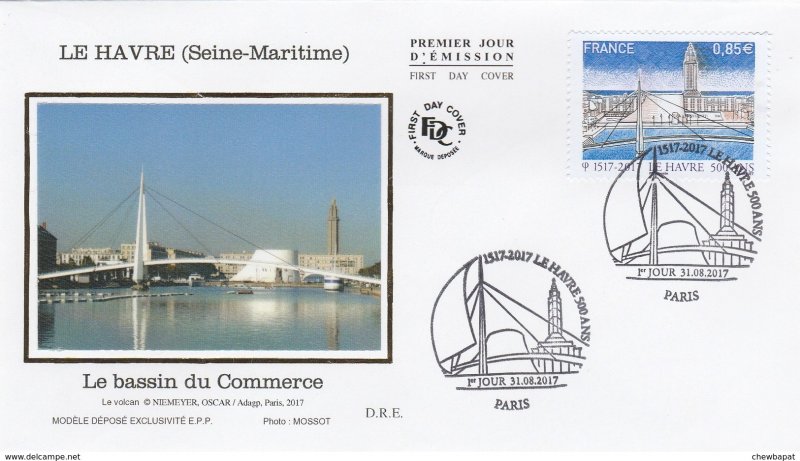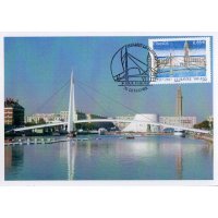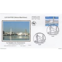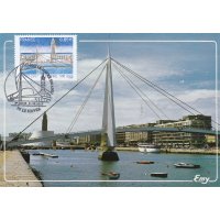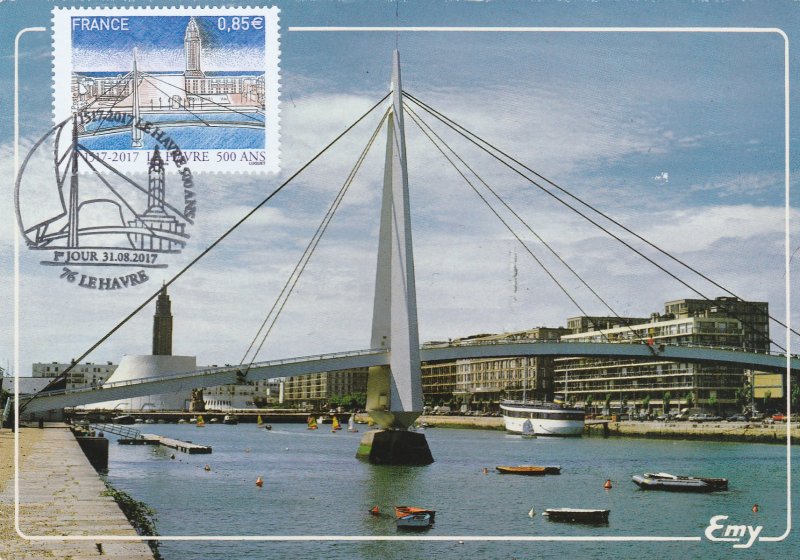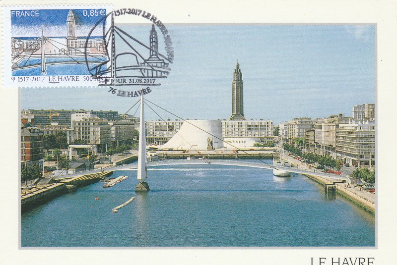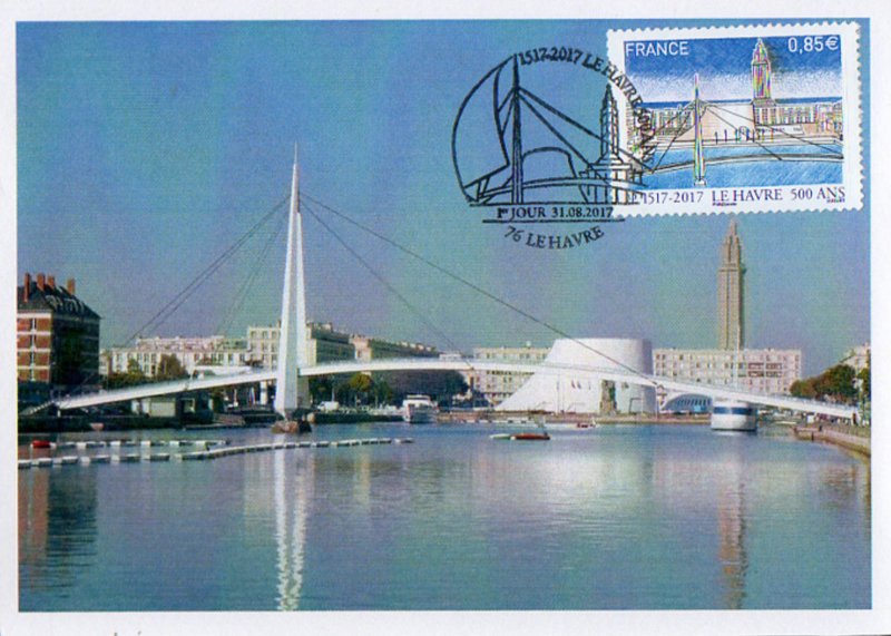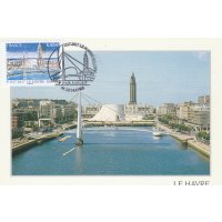 | Commentaire | En savoir plus sur Wikipédia : Le Havre Visuel - premier plan : le "Bassin du Commerce" que traverse la passerelle piétonne "François le Chevalier", oeuvre de Guillaume Gillet, construite à la fin des années 60, primée en 1972 au concours des Plus Beaux Ouvrages de Construction Métallique et rénovée récemment. - second plan : une perspective valorisant les oeuvres d'Oscar Niemeyer "Le Volcan" (nov.1982, ancienne Maison de la Culture, et depuis 1990, Scène nationale) et d'Auguste Perret : l'église Saint-Joseph (oct.1951 à oct.1957, consacrée en 1964) |