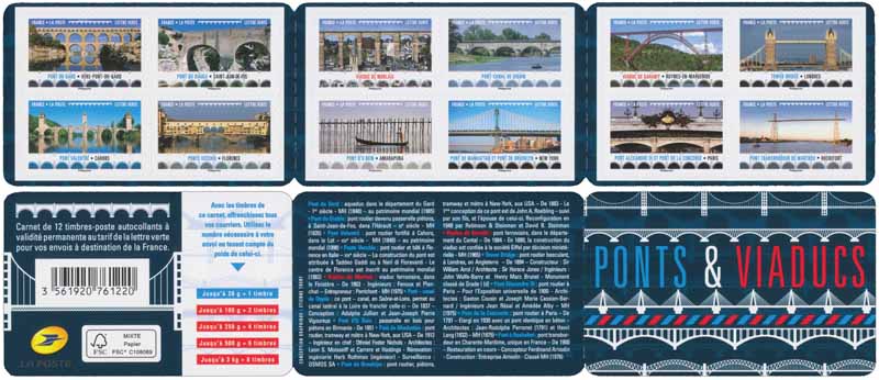 | Commentaire | Pont du Gard / Pont du Diable / Pont Valentré / Ponte Vecchio / Viaduc de Morlaix / Pont-canal de Digoin / Pont d’U Bein / Pont de Manhattan et pont de Brooklyn / Viaduc de Garabit / Tower Bridge / Pont Alexandre III et Pont de la Concorde / Pont transbordeur de Martrou Visuel de la couverture (volet droit) : présentation architecturale de face, de différents styles techniques et artistiques de ces ouvrages de liaisons entre deux rives. (volets, gauche et central) : présentation du carnet et utilisation des timbres pour l'affranchissement + La Poste + liste et caractéristiques des ouvrages présentés sur les TP. |