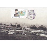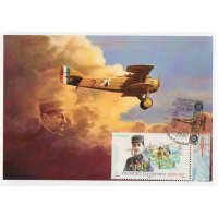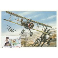 | Commentaire | En savoir plus sur Wikipédia : Georges Guynemer Visuel du TP : portrait de Georges GUYNEMER, avec son képi de capitaine et ses décorations françaises et étrangères. Le "Vieux-Charles", son monoplace "SPAD XIII S" / 2, peint en jaune, de "l'Escadrille des Cigognes" (Groupe de Combat n°12, formée à Reims, en 1912, appareils ornés d'une Cigogne). SPAD S.XIII : avion biplan de chasse, monoplace français, conçu par Louis Béchereau, mis en service, fin mai 1917 – Caractéristiques : 1 moteur Hispano-Suiza 8B 8 cylindres en V, refroidis par eau – 220 ch (162 kW) – envergure : 8,10 m / Long. : 6,30 m / Ht. : 2,35 m / surface alaire : 21,1 m⊃2; - masses : 566 kg à 845 kg - 234 km/h / 6 650 m / 120 m/mn / rayon action : 350 km – 2 mitrailleuses Vickers synchronisées cal. 7,7 mm, approvisionnées chacune à 500 cartouches) - 8 472 avions construits. |