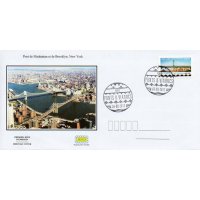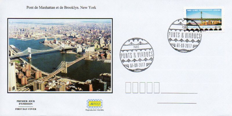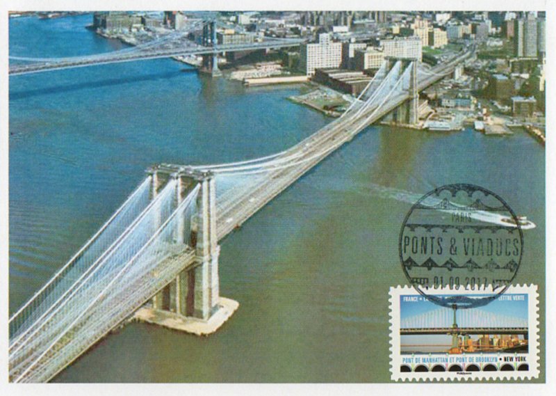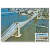 | Commentaire | En savoir plus sur Wikipédia : Pont de Manhattan En savoir plus sur Wikipédia : Pont de Brooklyn Pont de Manhattan (New-York - Etats-Unis) : c'est un pont suspendu de la ville de New-York au-dessus de l'East River, qui relie la partie inférieure de l'île de Manhattan à l'arrondissement de Brooklyn. Le pont possède deux niveaux de circulation. Le niveau supérieur offre quatre voies pour les véhicules, deux dans chaque sens. Sur le niveau inférieur, on trouve trois voies pour les véhicules, quatre voies ferrées pour le métro et une allée pour les piétons. À ce niveau, le sens de circulation peut être modulé selon les besoins du trafic : les trois voies dans le même sens, ou deux voies dans un sens et une à l'opposé. La circulation du métro a été plusieurs fois interrompue sur le pont de Manhattan depuis 1984. Il sert de passage à deux lignes différentes (2 × 2 voies), connues sous les noms de North tracks (Nord) et South tracks (Sud). Cela est principalement dû à la conception du pont, qui n'est pas bien adapté au transit ferroviaire. Le passage des rames provoque des oscillations qui à leur tour endommagent les voies. Ce tronçon de la ligne du Sud a été fermé entre 1990 et 2001, celui de la ligne du Nord entre 2001 et 2004. Technique : construction du pont : 1901-1912 / architectes : Othniel Foster Nichols et Léon Moisseiff (1872-1943) / type : pont suspendu / Long. 2 090 m, portée principale : 448 m, larg. 36,6 m, ht. des pylônes : 102 m, ht. au dessus de l'eau : 41,1 m / Ø des 4 câbles : 53,975 cm / matériaux : acier et maçonnerie |