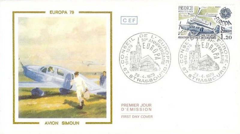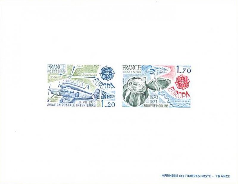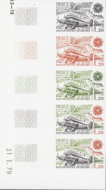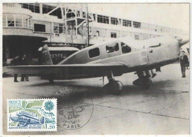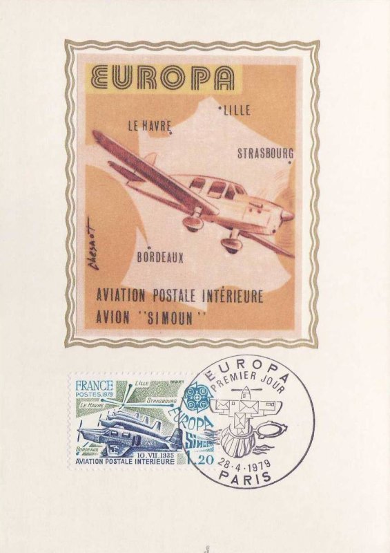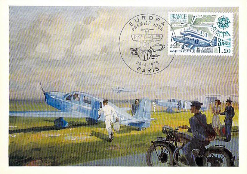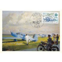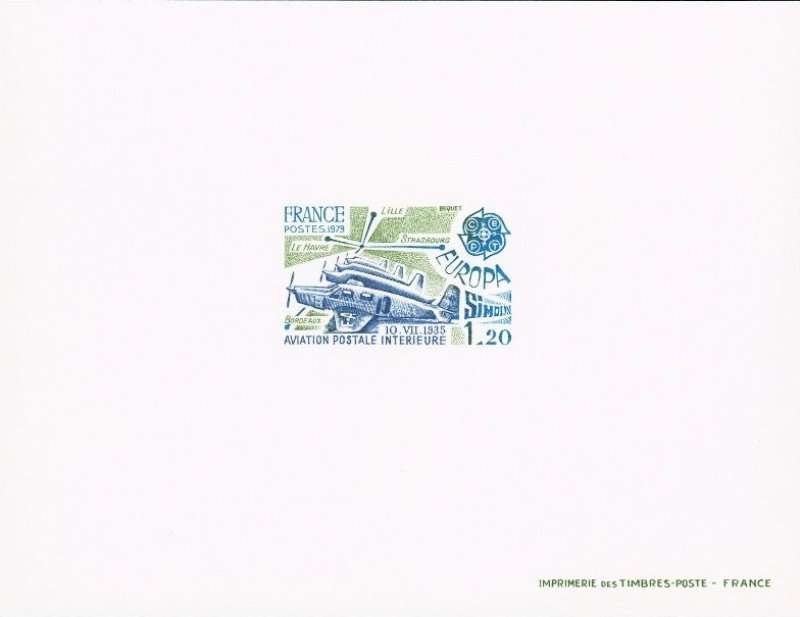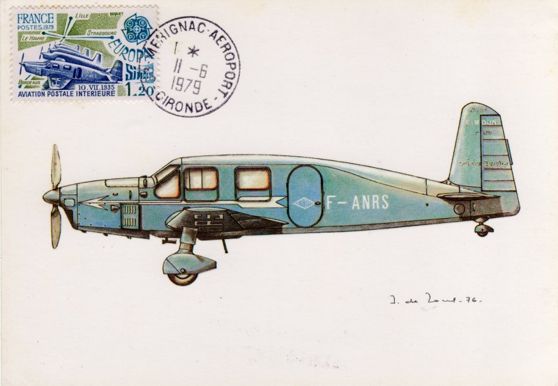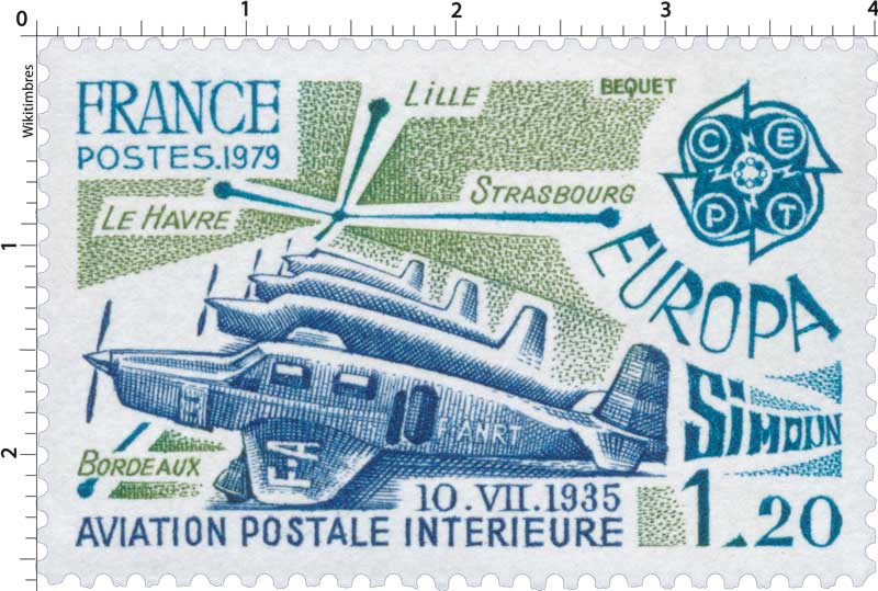 | Description | Europa. Aviation postale intérieure. Création des quatre lignes Lille - Le Havre - Strasbourg - Bordeaux, le 10 juillet 1935, et représentation des monoplans Caudron Simoun à moteur Renault |